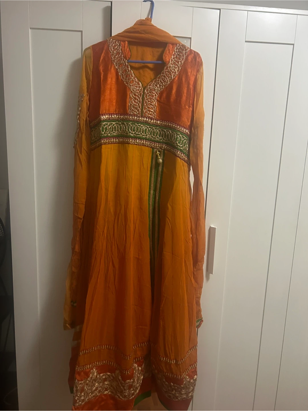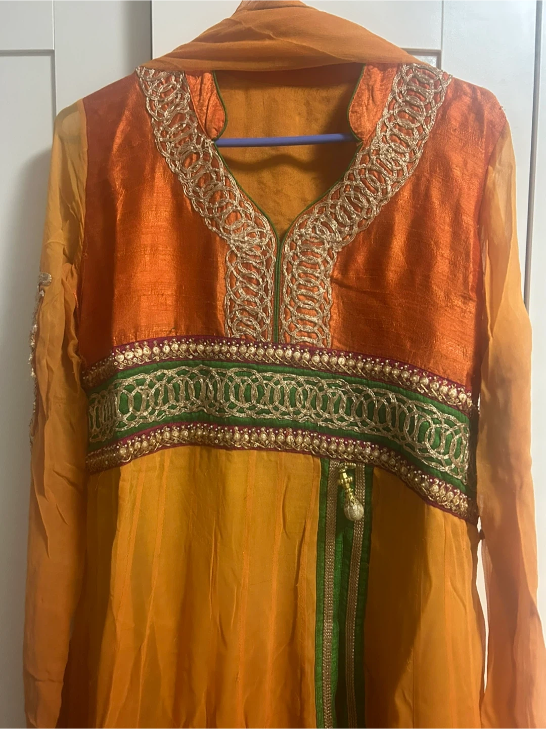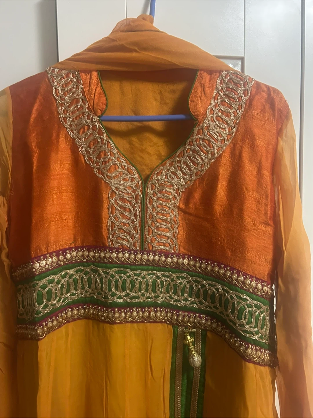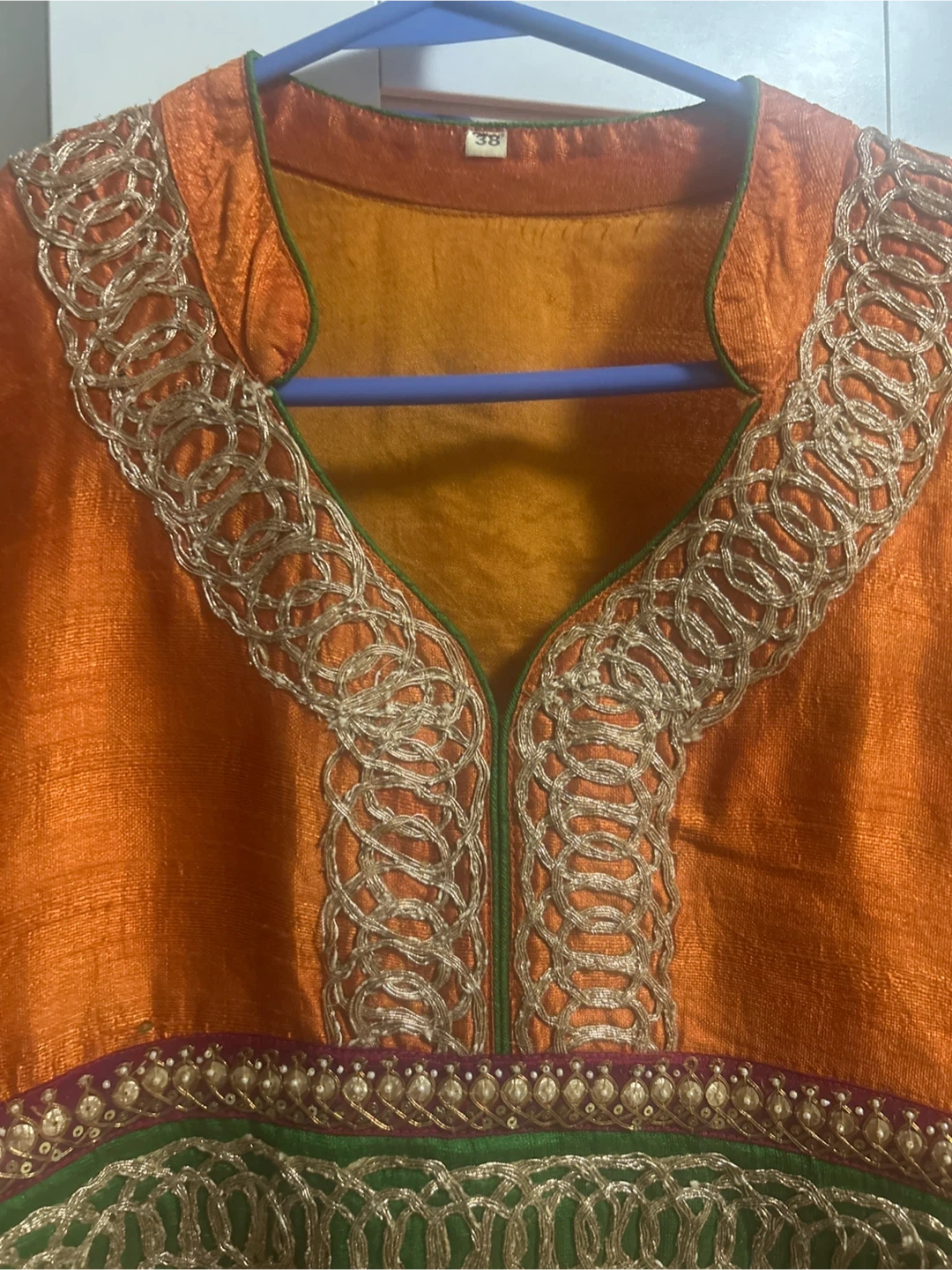 This beautiful orange and yellow kurti features intricate embroidery around the neckline and hem. It's made from a shimmery fabric and comes with a matching dupatta. Size is marked as 38.
