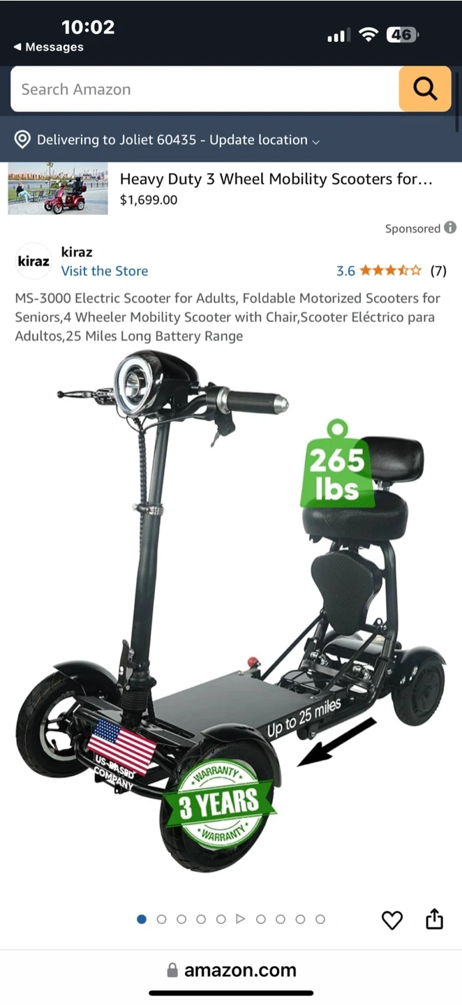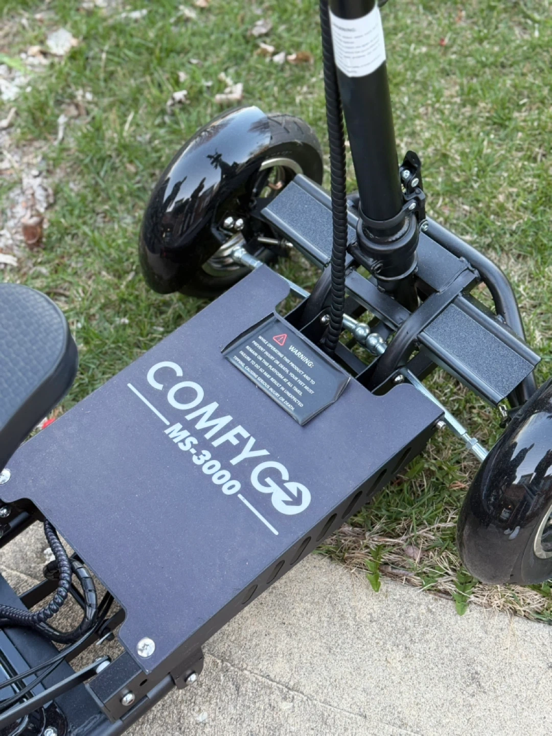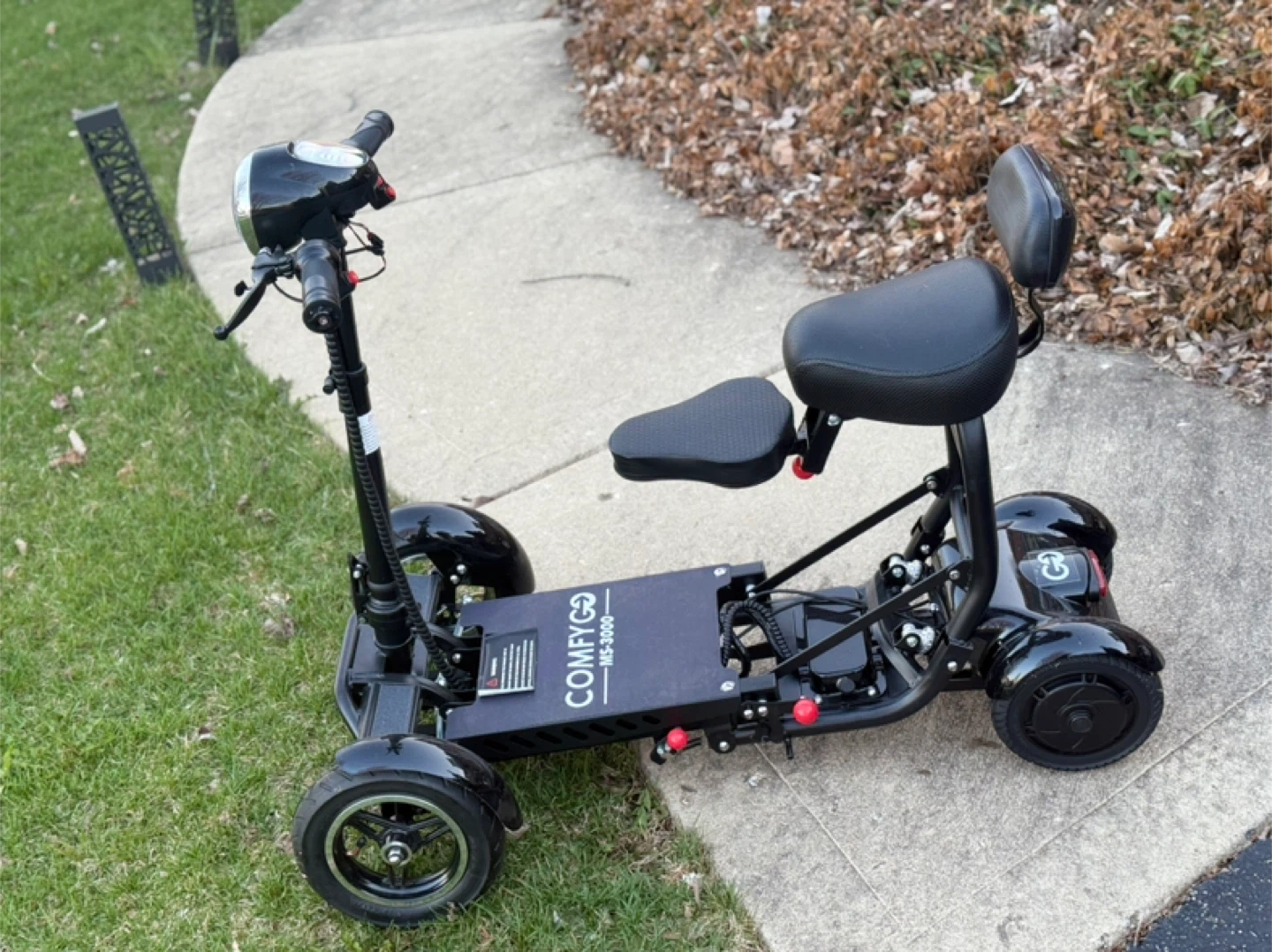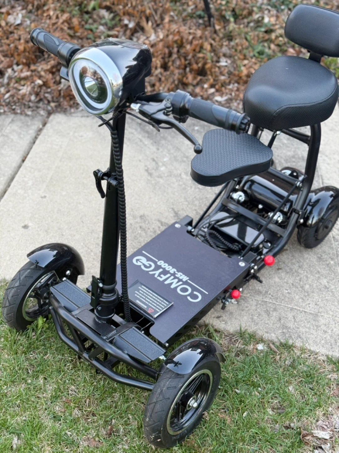 This is a ComfyGo MS-3000 electric mobility scooter. It's foldable and has a seat with backrest. The scooter has a top speed of 25 miles per hour and a range of 25 miles on a full charge.