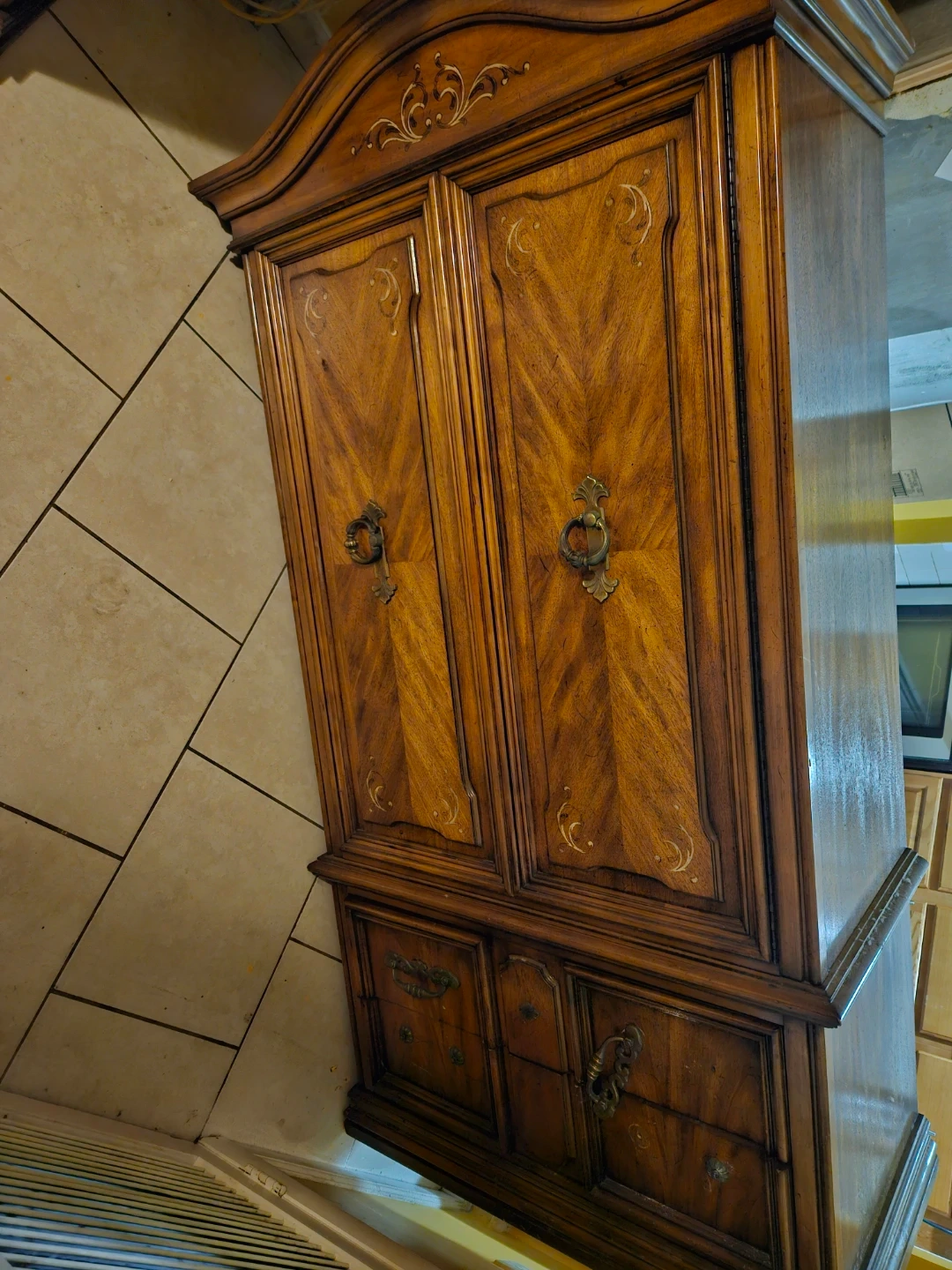 This is a beautiful vintage wooden armoire with decorative detailing. It features double doors opening to shelves and drawers inside, plus additional drawers at the bottom. The wood has a rich finish and ornate handles.