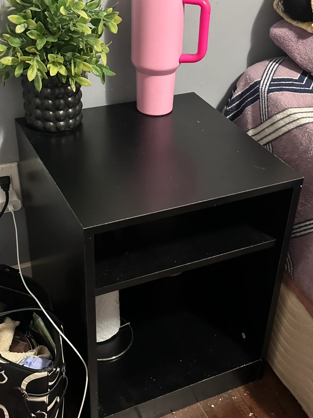 This black end table has two open shelves for storage. It's perfect for placing next to a bed or couch. The top surface is flat for displaying items.