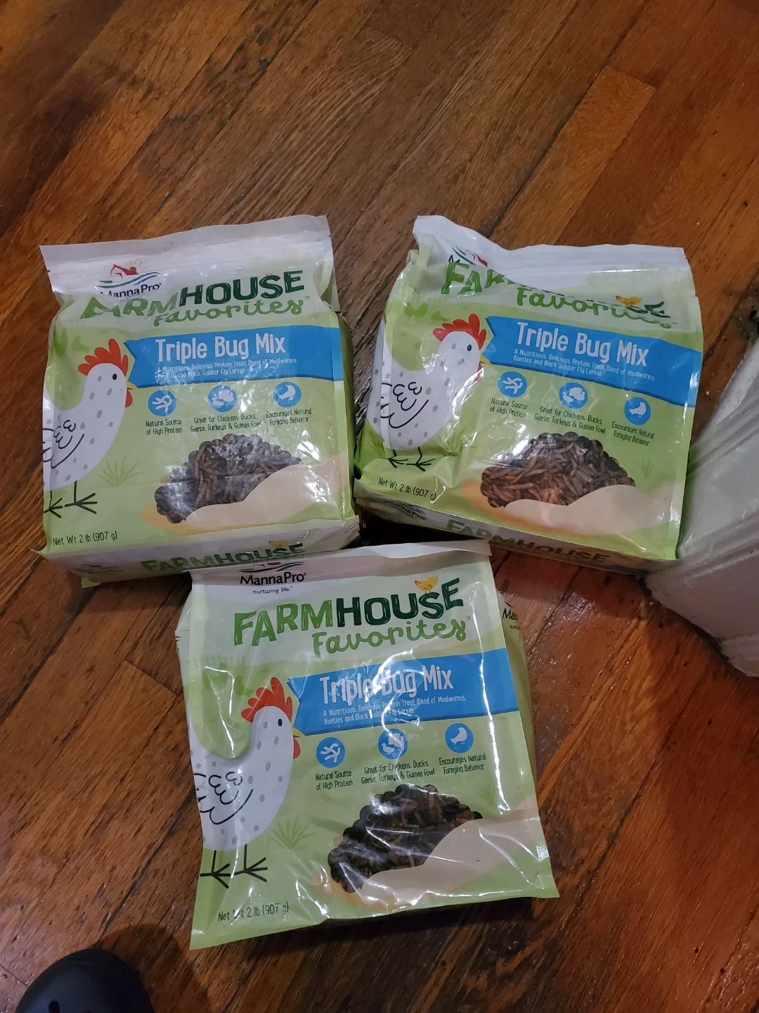 This is a 3-bag lot of Manna Pro Farmhouse Favorites Triple Bug Mix. It's a nutritious, delicious protein treat blend for poultry.