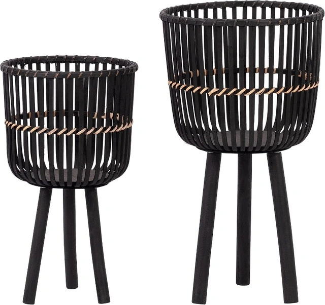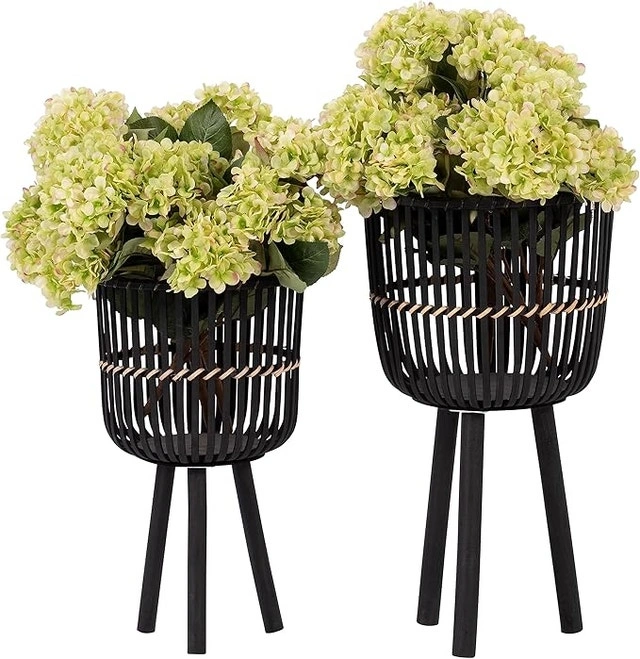 Brand new set of 3 Edmund 2 Piece Tri-Footed Bamboo Planter Set for Garden, Patio, Entryway, or Livining room -one tall, size 23"x12" -two smaller, size 19"x10" (see first picture for different breading wicker line pattern color black pickup near chinook --------- Layer texture and a playful modern look with this pair of cachepot stands. Crafted from eco-friendly bamboo, they feature airy basket designs with a band around the center for an eclectic vibe. Tripod bases give them a little lift, so they elevate your plants off of the floor. One stand is taller than the other, so they also add some visual dimension to a room. These work best if you're placing a plant already in a pot inside them. Features The black finish of these Sagebrook Home bamboo footed planters adds a modern and sleek touch to any décor, making them a versatile addition to your indoor or outdoor space. -Perfect for use in your garden, patio, or living room, these planters are sure to elevate the look of any area they are placed in. -The black finish creates a bold and dramatic look, while the light airy openness of the planter adds depth and dimension to your home décor. -The larger planter measures 23" high x 12" diameter, and the smaller one measures 19" high x 10" diameter, perfect for displaying a variety of plants and flowers. -Constructed with durable and weather-resistant bamboo wood, these planters are built to last and withstand outdoor elements as well as being designed to elevate your indoor spaces. -The woven bamboo and footed design adds an elevated touch, ensuring that your plants stay well-drained and healthy while also providing a stylish display option.