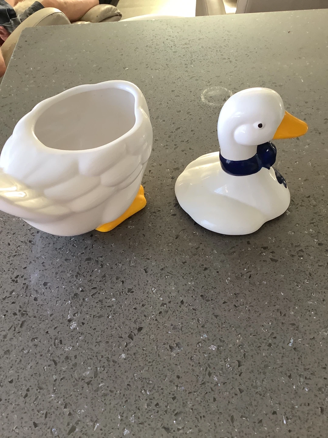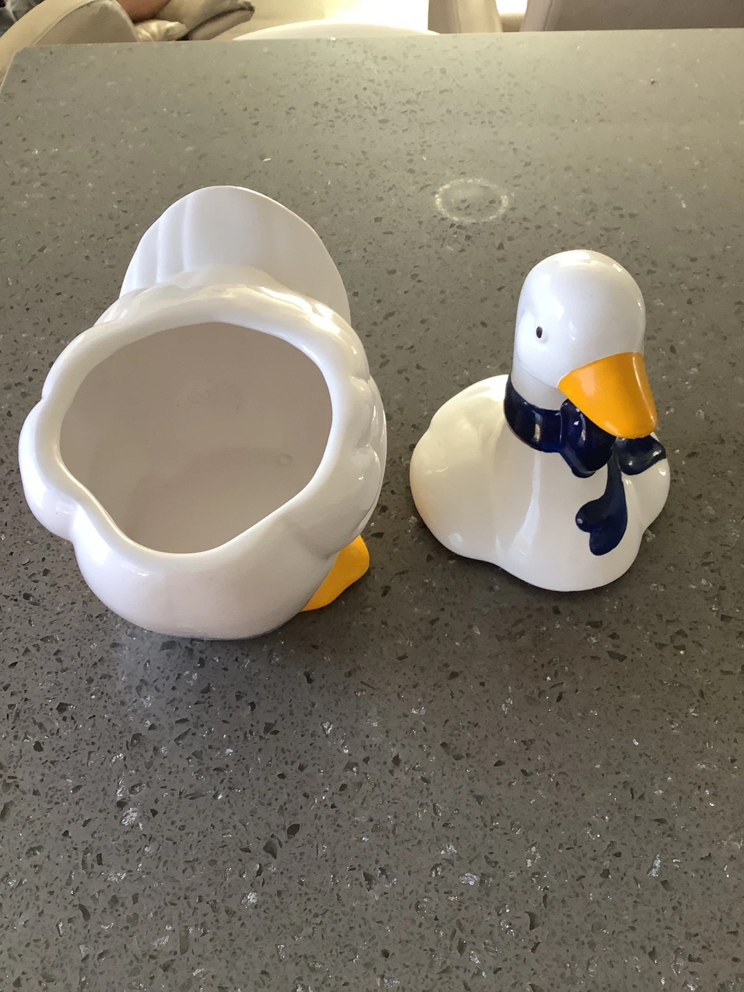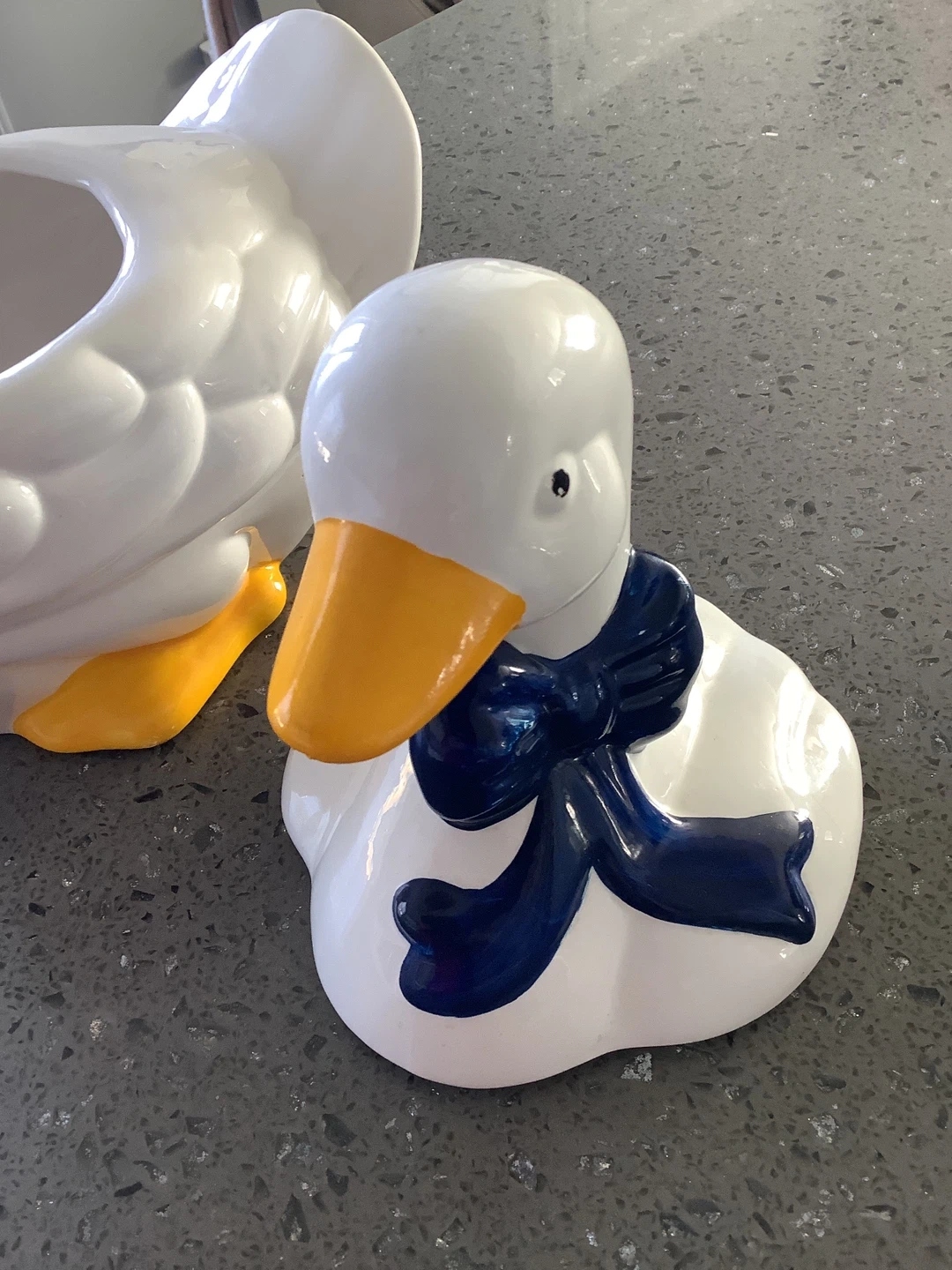 Cute ceramic Goose Cookie Jar. It's in great condition and perfect for storing small items like coffee filters or cookies or just as a decorative piece