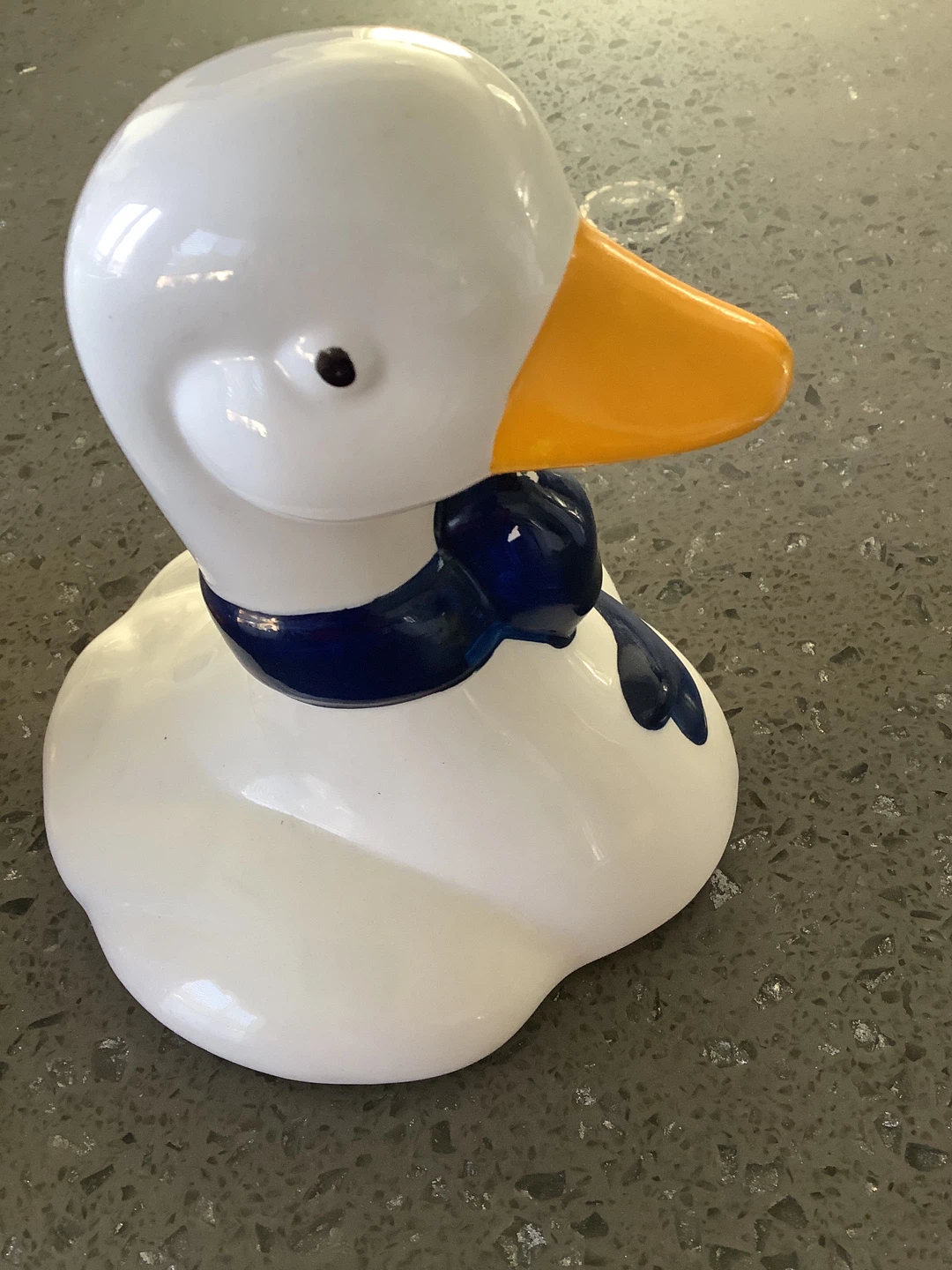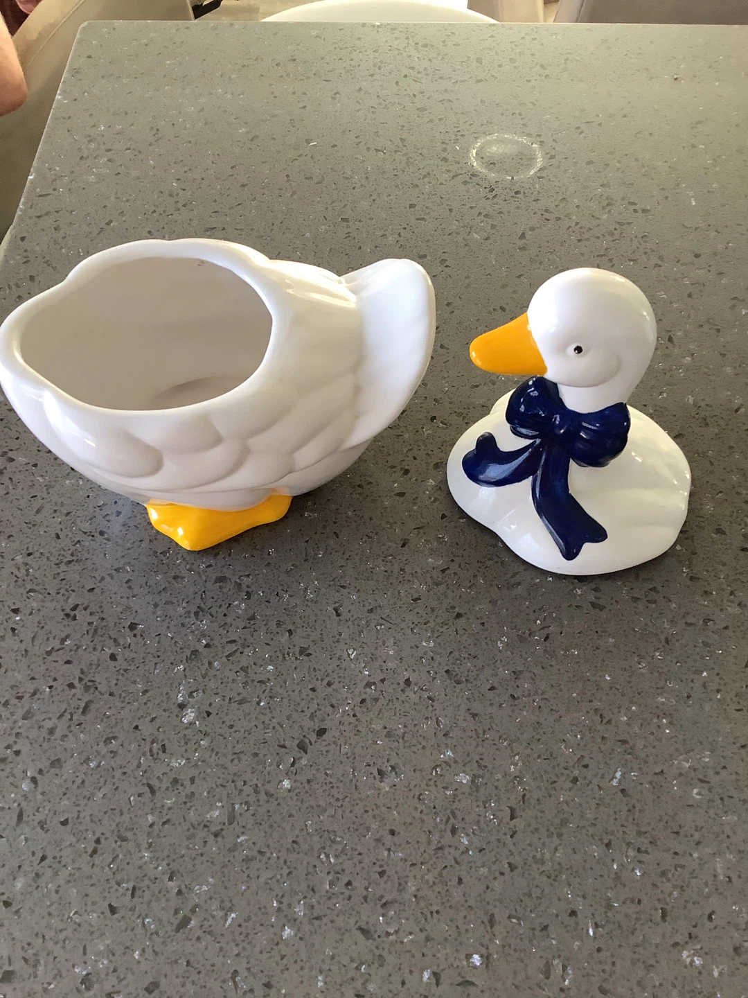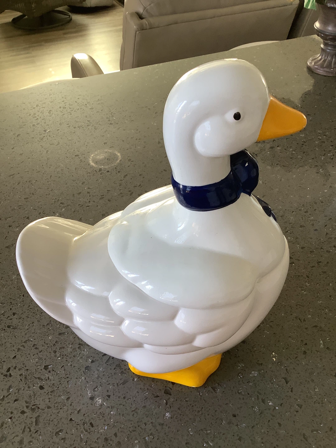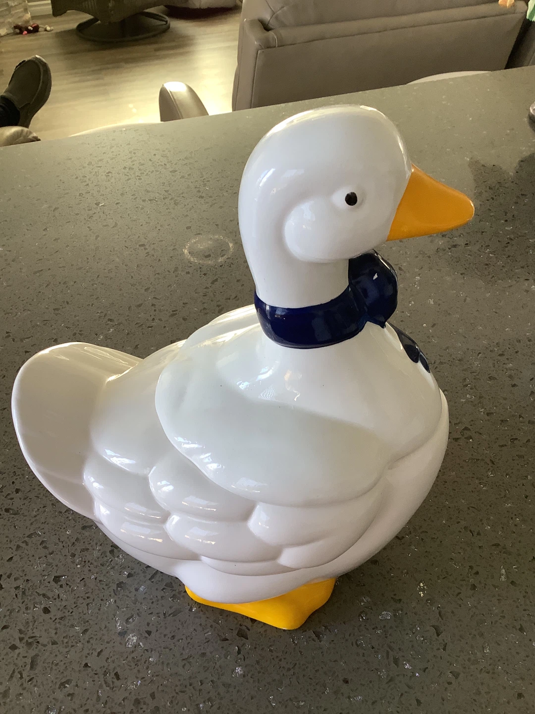 Cute ceramic Goose Cookie Jar. It's in great condition and perfect for storing small items like coffee filters or cookies or just as a decorative piece