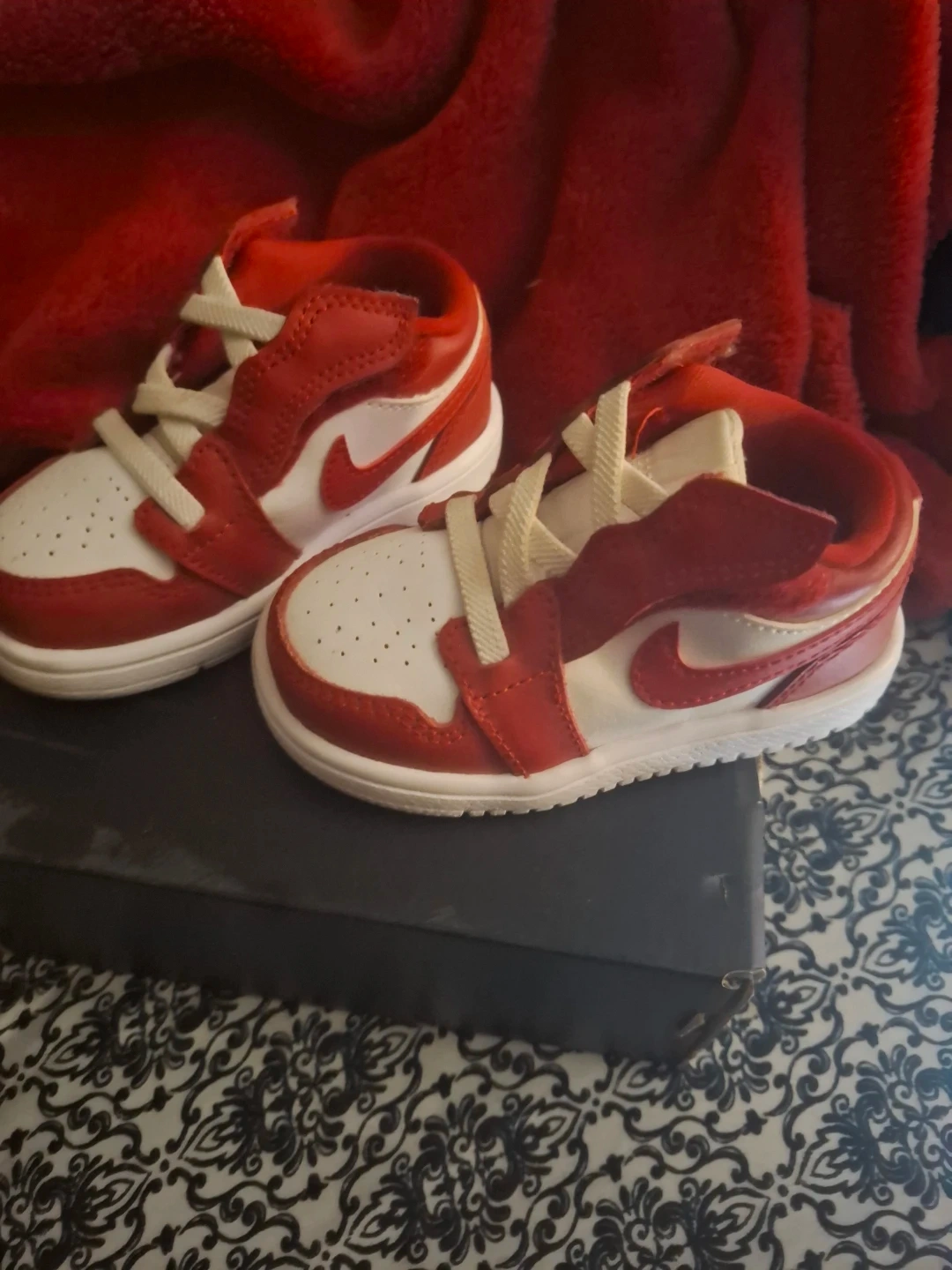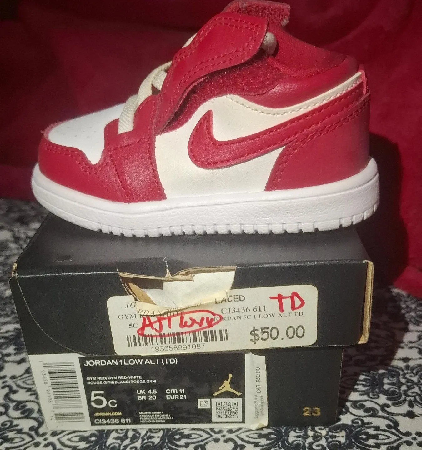 These Jordan 1 Low Alt TD toddler shoes are a stylish red and white colourway. They come in a size 5C with a hook-and-loop closure for easy on and off. Includes original box.