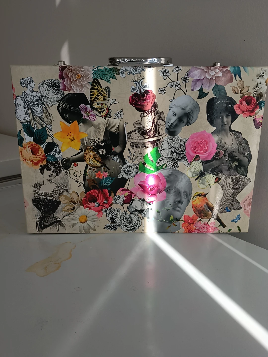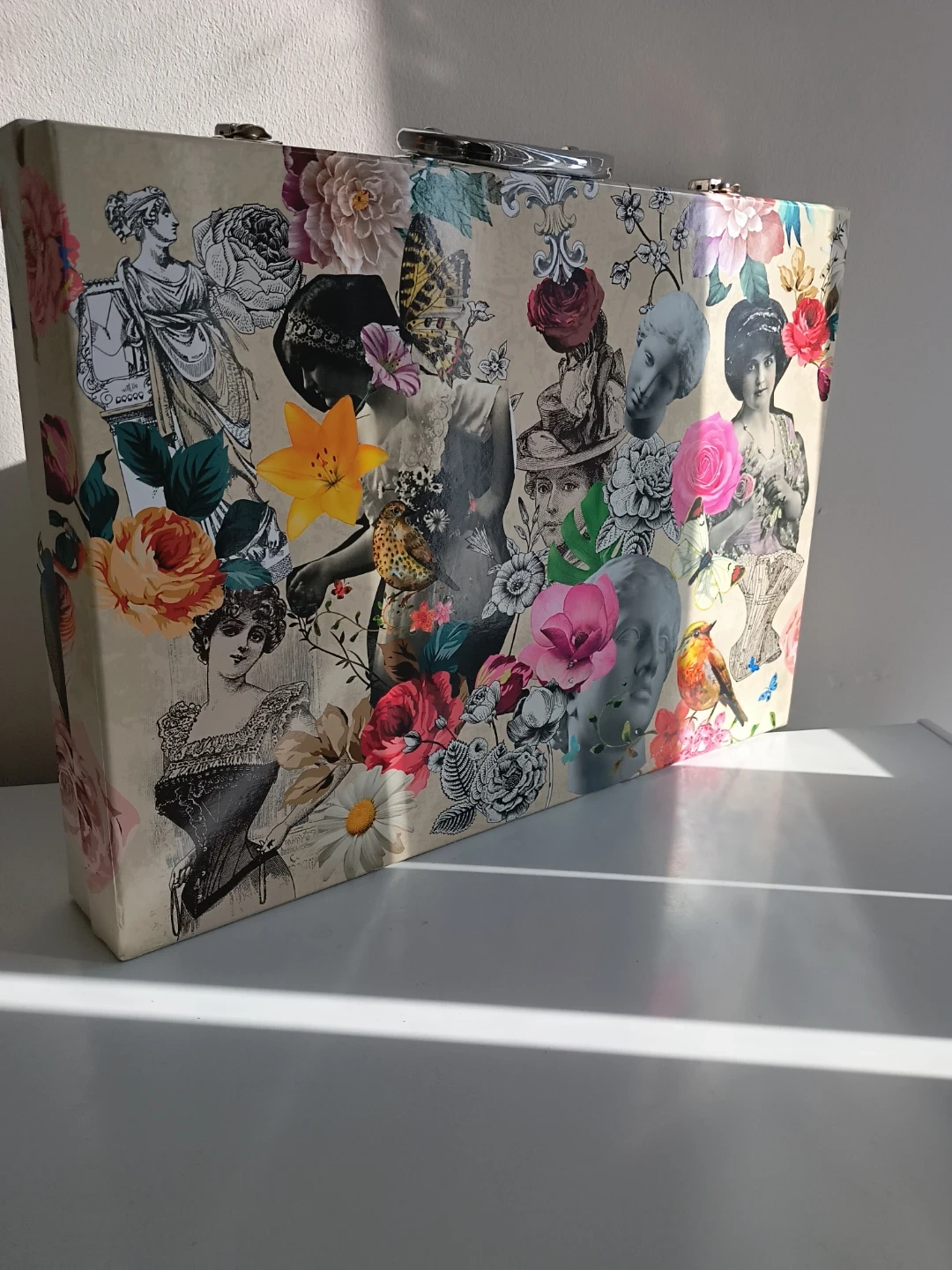 A charming decorative storage box featuring a vintage collage of portraits and floral patterns. It's perfect for stashing away small treasures or keepsakes. The sturdy construction includes a metal handle and clasp for secure closure. This box would look lovely on a vanity or shelf!