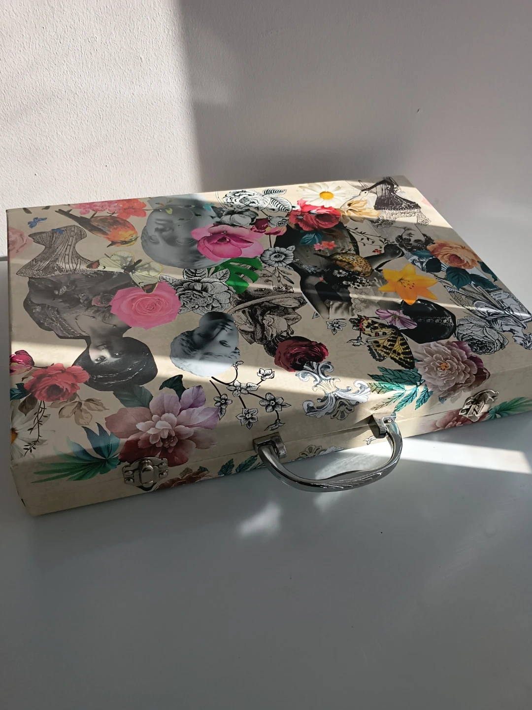 A charming decorative storage box featuring a vintage collage of portraits and floral patterns. It's perfect for stashing away small treasures or keepsakes. The sturdy construction includes a metal handle and clasp for secure closure. This box would look lovely on a vanity or shelf!