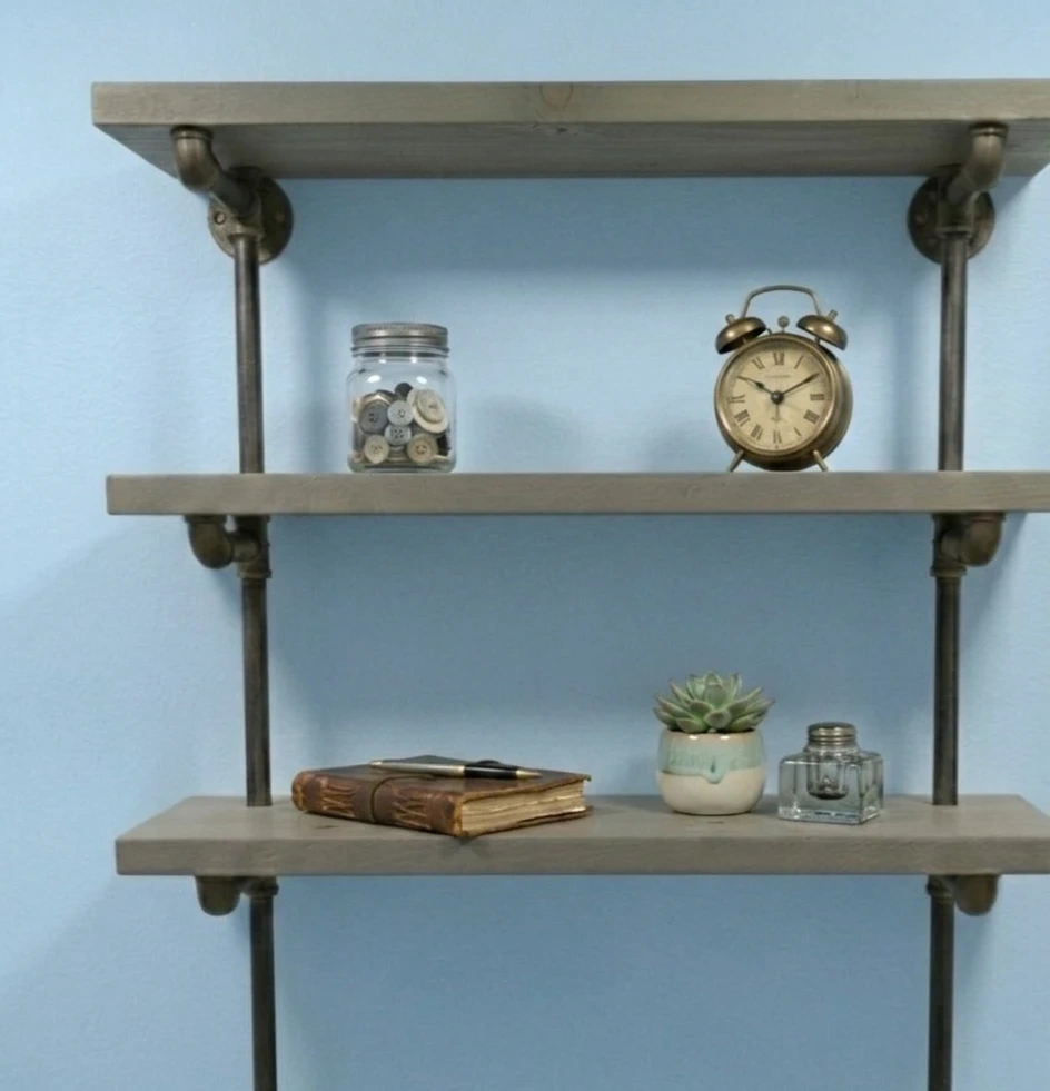 This industrial-style shelving unit features three grey wood shelves supported by dark metal pipes. It's perfect for displaying books, plants, or decorative items in any room. The open design adds a modern, rustic touch to your home.