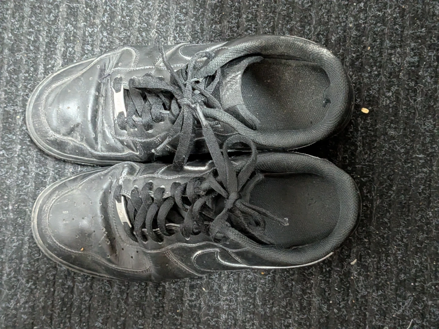 Classic black Nike Air Force 1 Low sneakers. These kicks feature a leather upper and rubber sole. They show signs of wear but are still ready for more adventures. Perfect for everyday wear or casual outings!