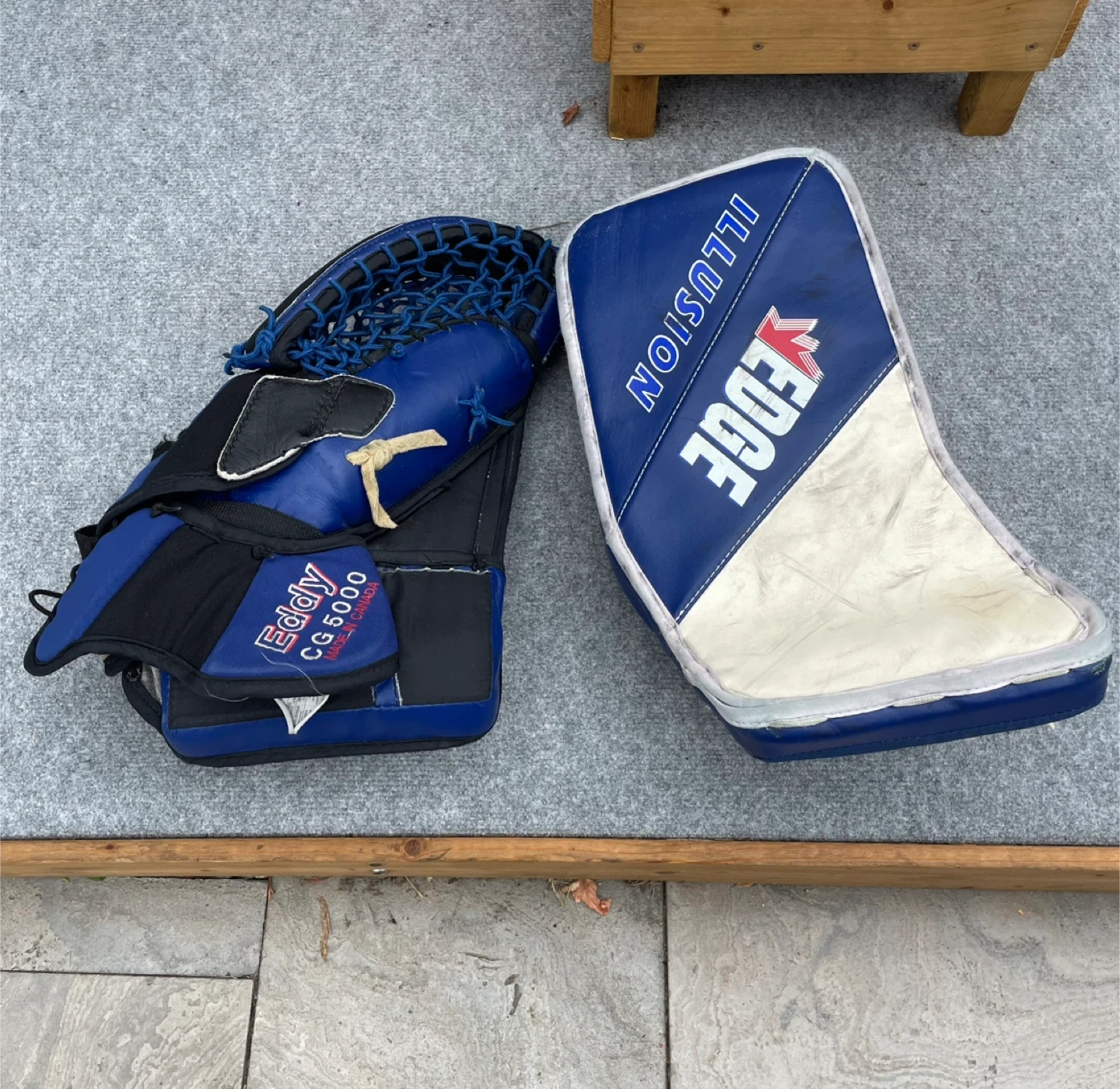 Selling a used Eddy Illusion goalie glove and blocker set. They're in good condition and ready for the ice. Perfect for anyone looking to upgrade their gear or get started playing goalie