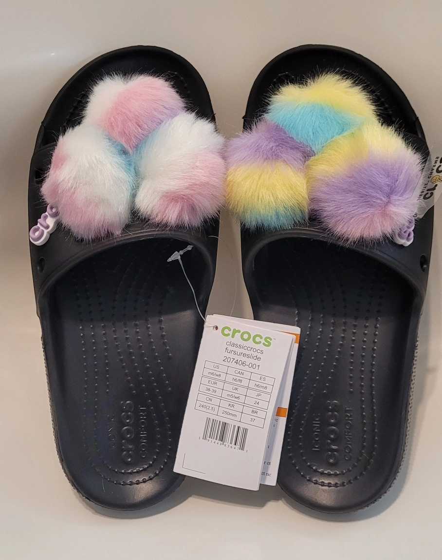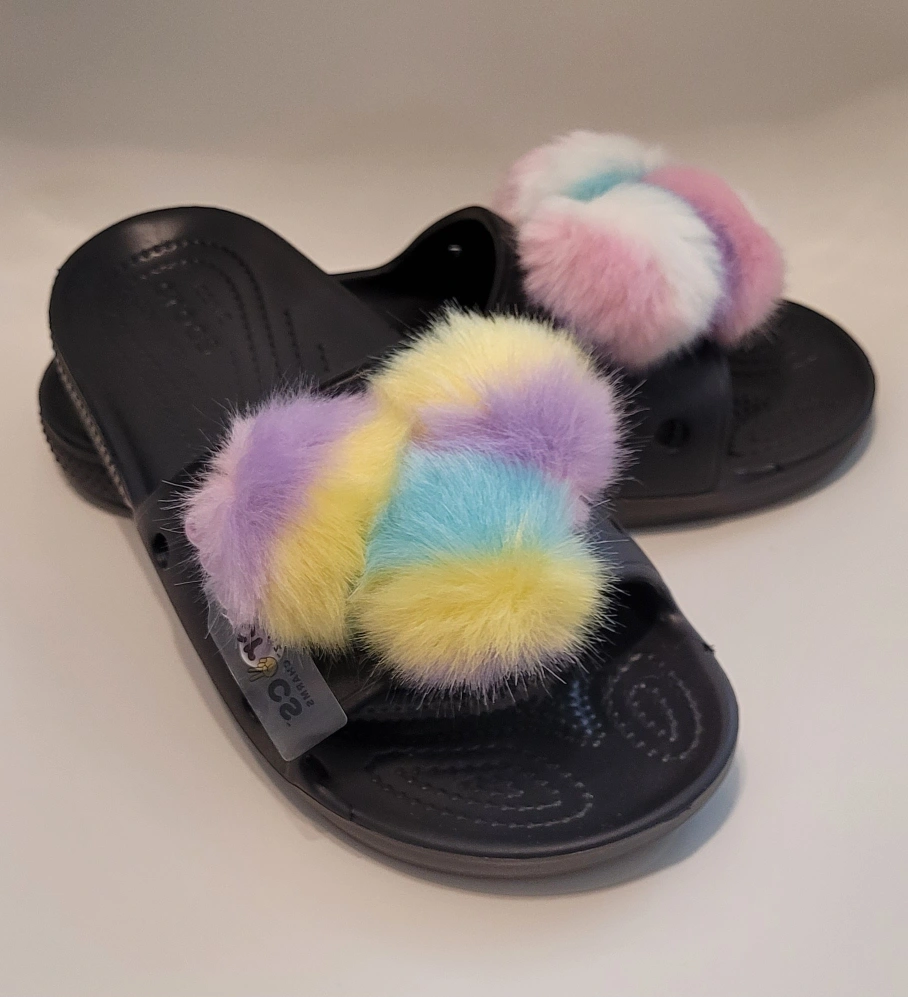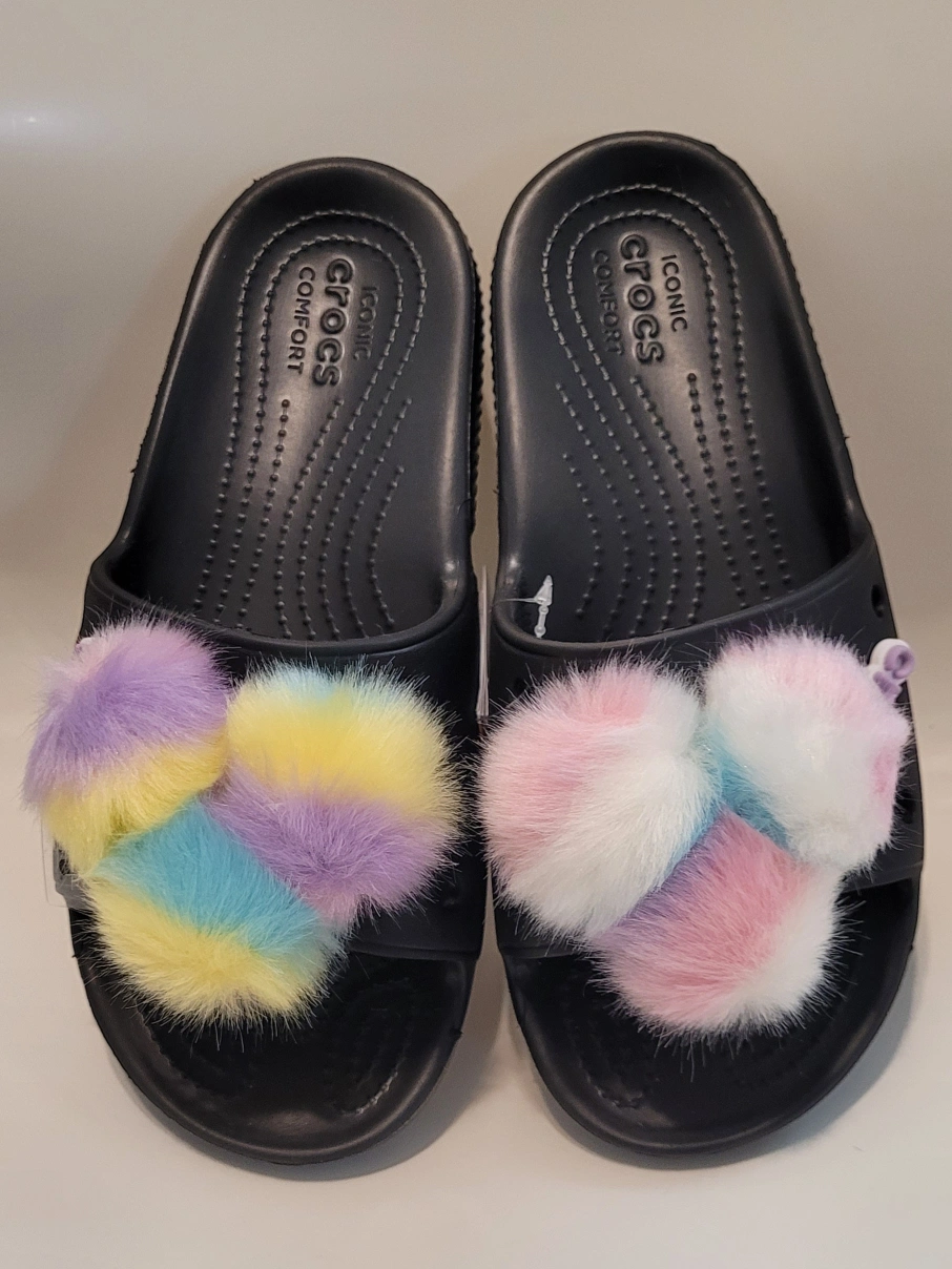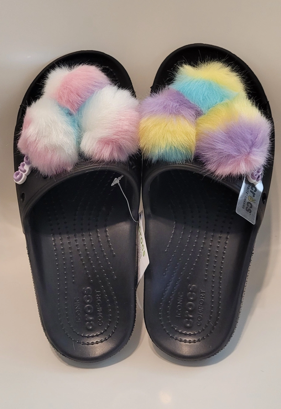 Classic Croc Black slides with 6 super cute pastel coloured fur pom poms.