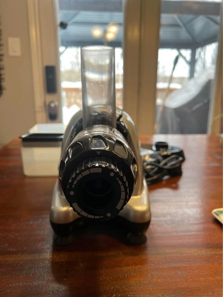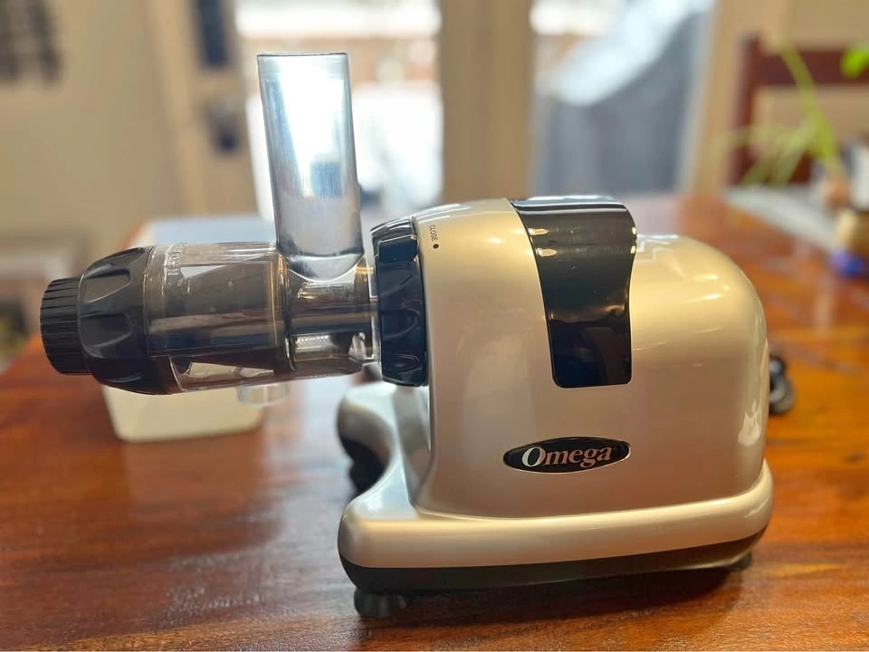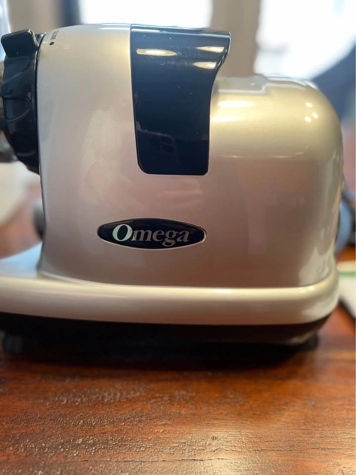 This is the Omega J8006HDS Nutrition Center, a horizontal, slow-speed (80 RPM) masticating juicer. It's designed for high juice yield and maximum nutrient retention. This quiet, silver machine uses a triple-stage system to process fruits, vegetables, and leafy greens while minimizing heat build-up and oxidation. It can also be used to make nut butters, pasta, and baby food.