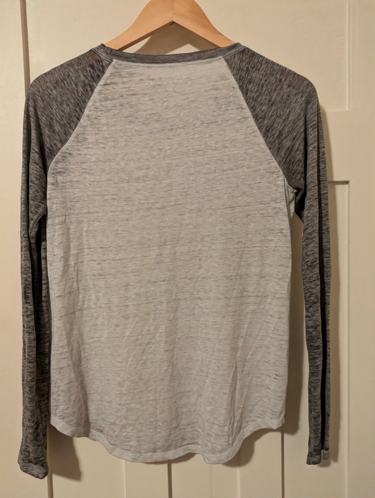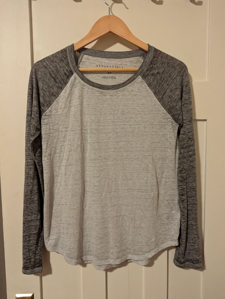 Long sleeved baseball style thin (you can see through it) by Aeropostale. Darker grey sleeves and light grey body. Size small. Top has never been worn just stored in a drawer.