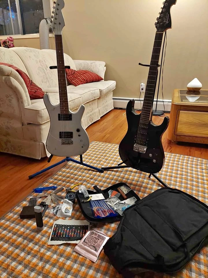 2 electric guitars, the black one is fine but the gray one is in poor condition and has a broken string.