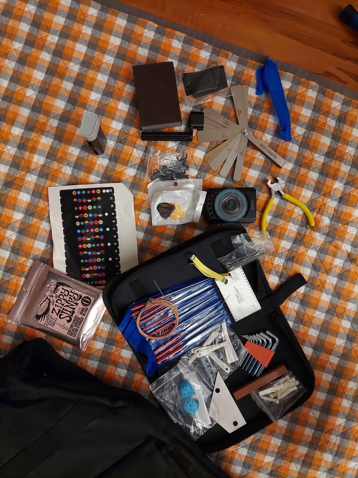 2 electric guitars, the black one is fine but the gray one is in poor condition and has a broken string.