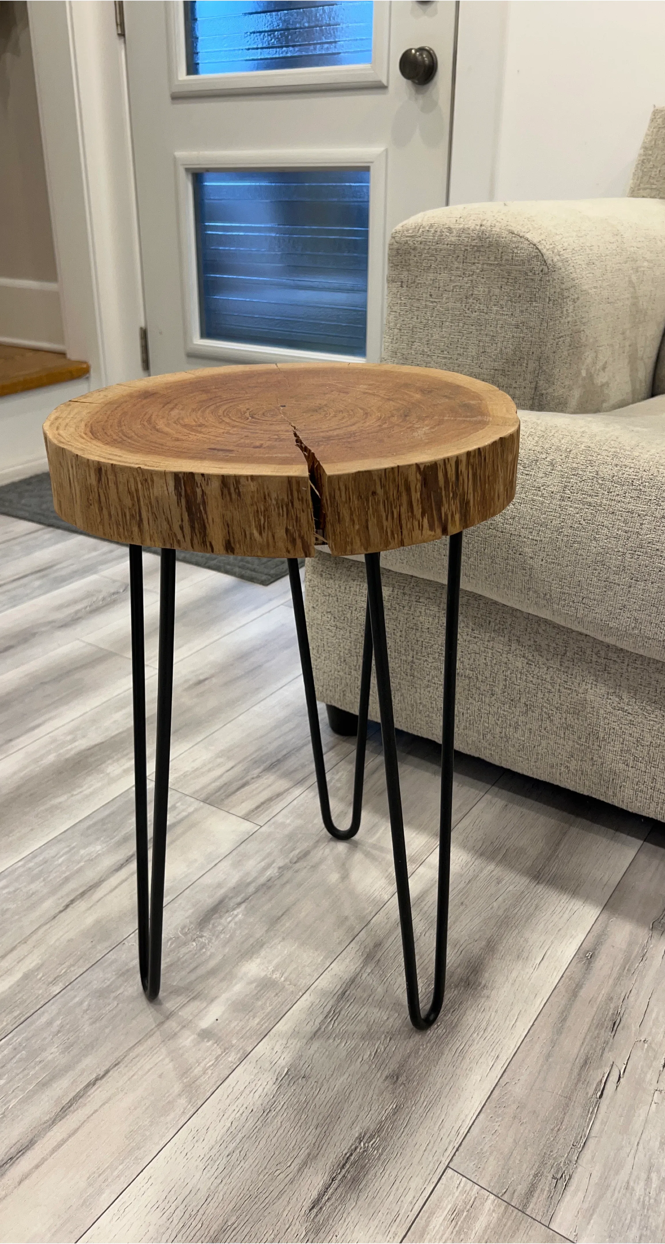 Unique live edge wood slice side table. It features a natural wood top with a crack down the middle and three black hairpin metal legs. It's a great accent piece for any room!