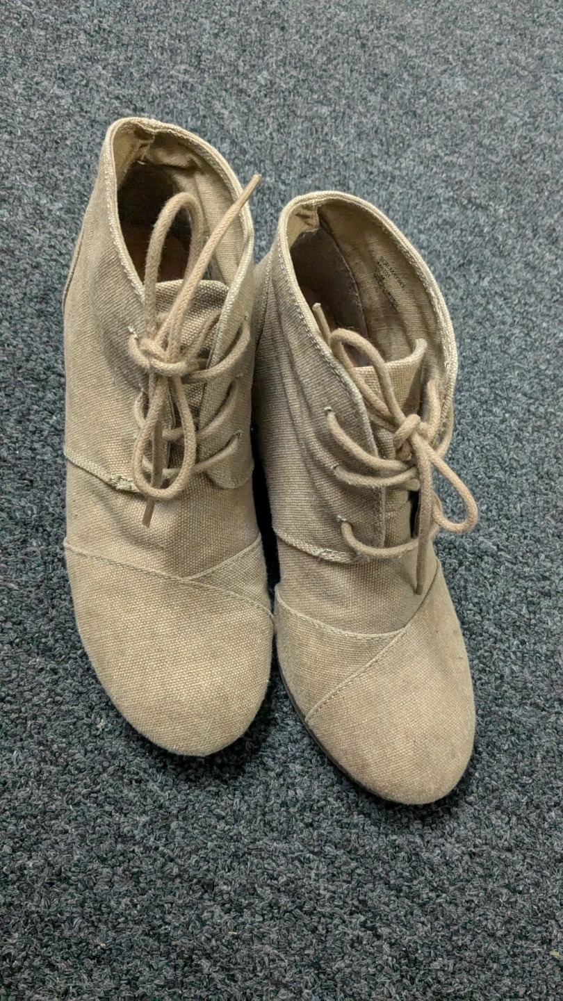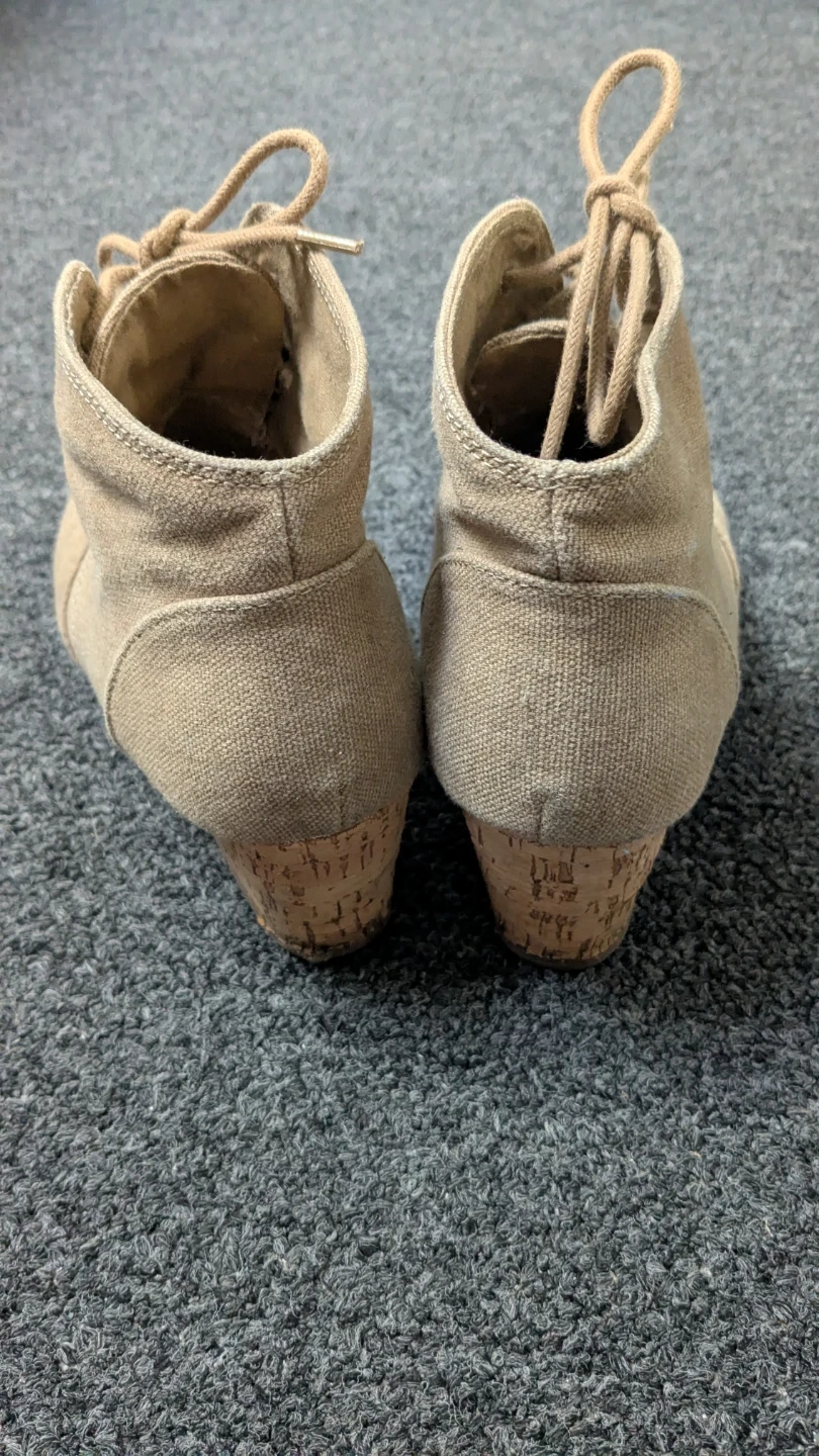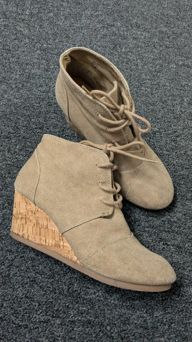 These Toms wedge ankle boots come in a neutral tan canvas with a cork wedge heel. They feature a lace-up front and a comfortable ankle height. Perfect for adding a stylish touch to any casual outfit!