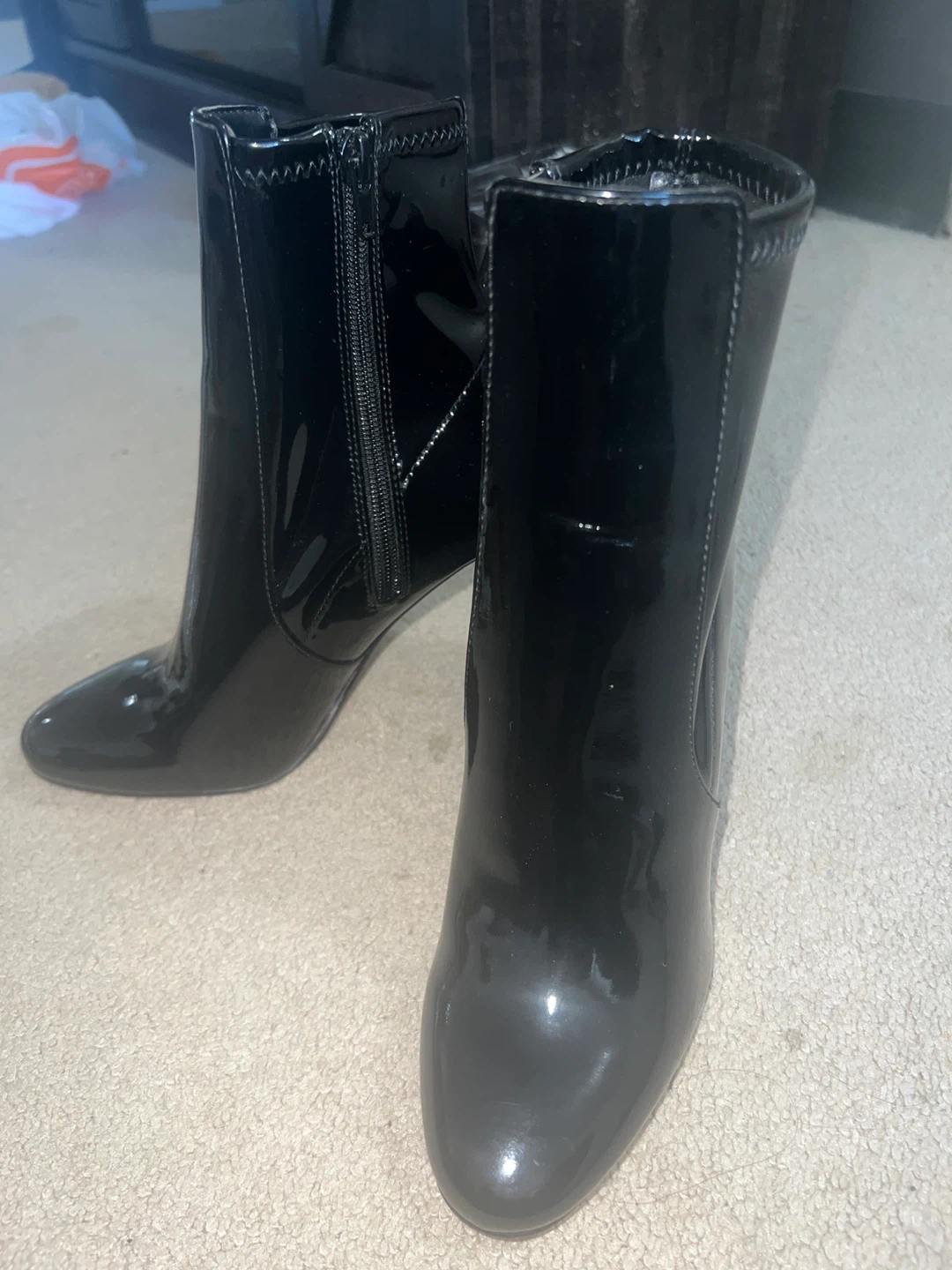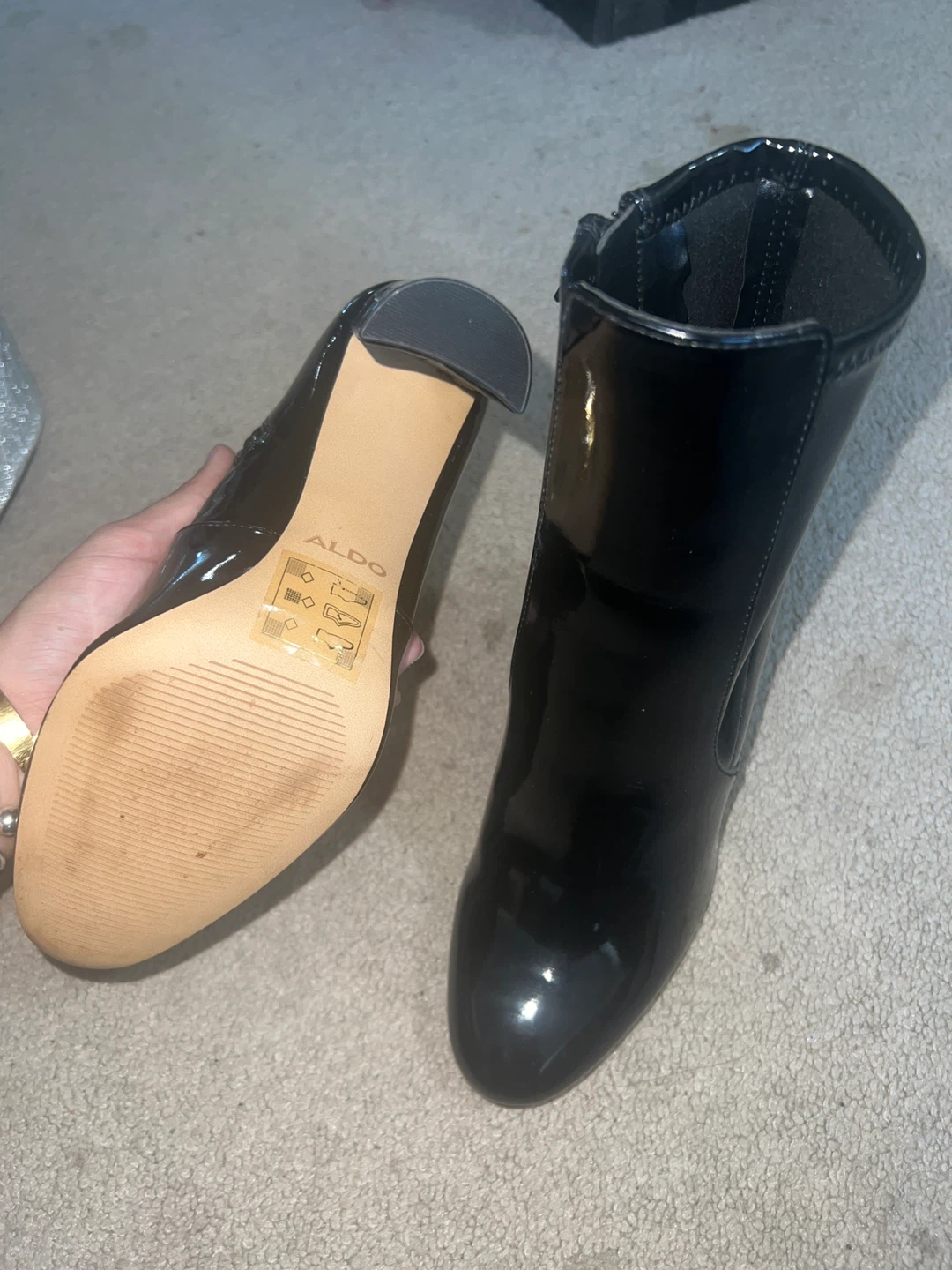 Stylish black patent heeled ankle boots from ALDO. Features a side zipper for easy on and off. These boots have a sleek, modern look. They're perfect for dressing up an outfit!