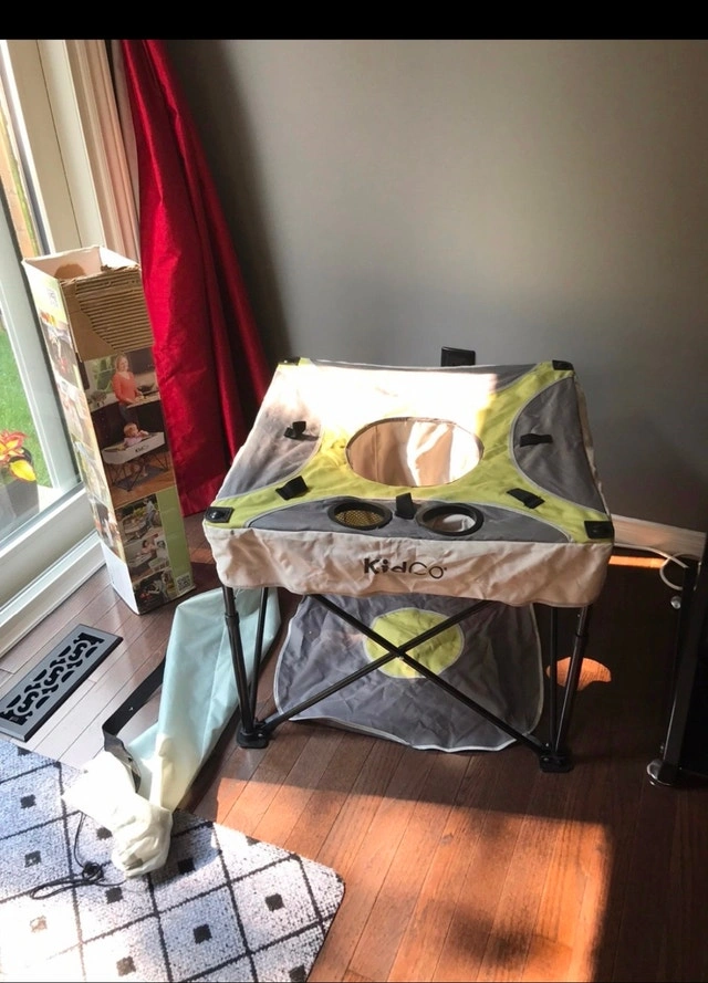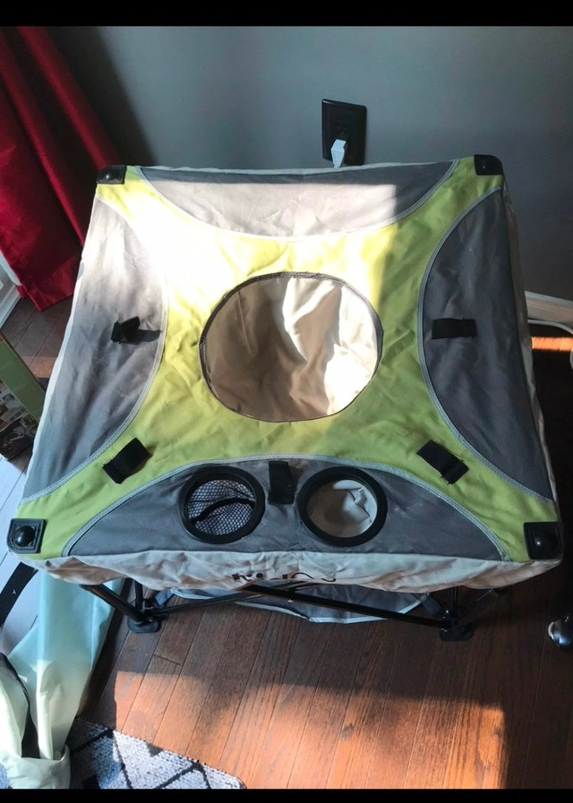 Portable activity seat. Folds flat for easy storage. Grey and green colour scheme. Includes carrying bag. Used one time only. It’s in great condition.