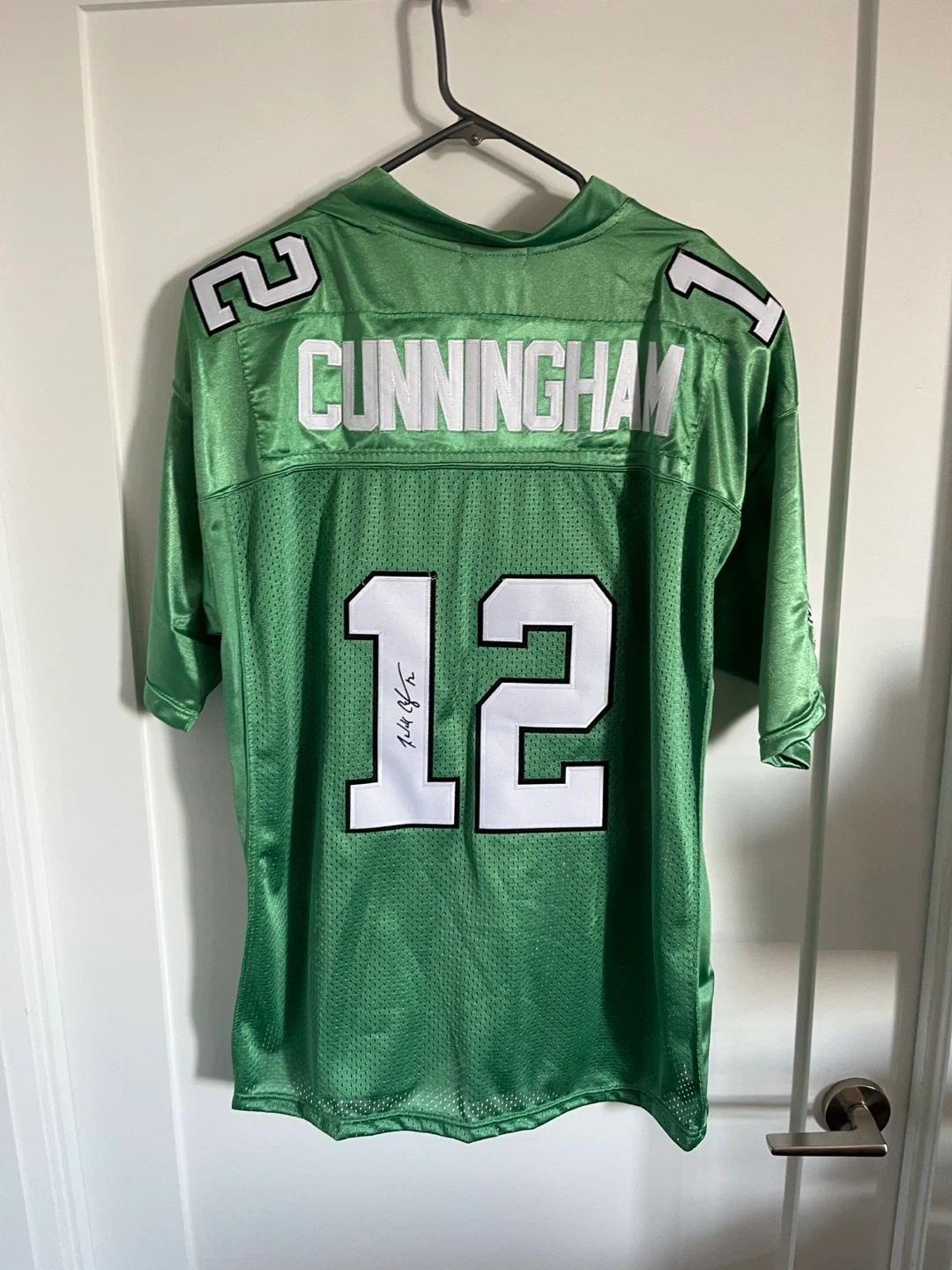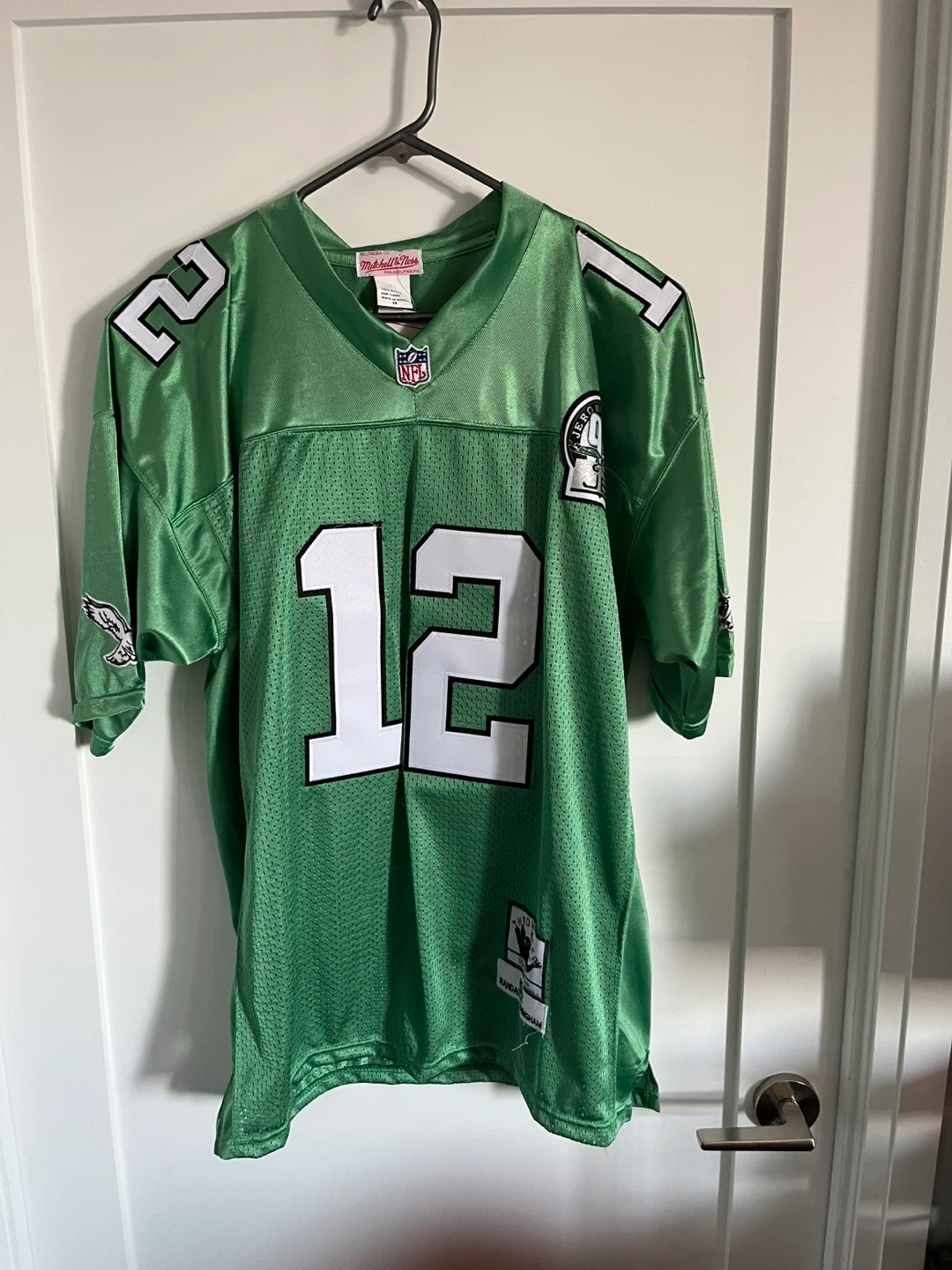 Selling a Mitchell & Ness throwback jersey of Randall Cunningham from the Philadelphia Eagles. The jersey is green with the number 12 and Cunningham on the back. It's in great condition and perfect for any Eagles fan!