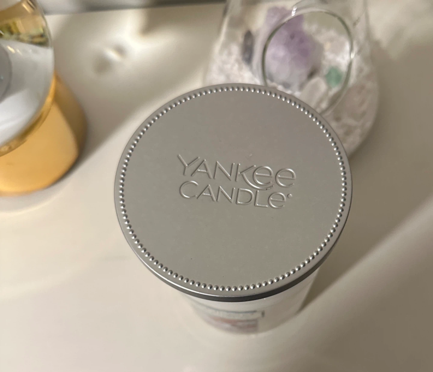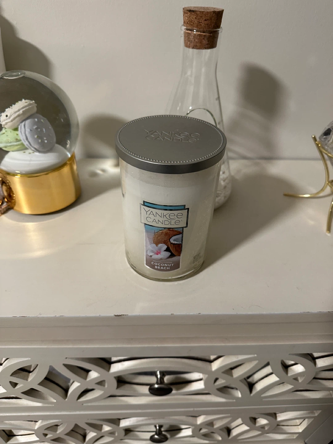 This is a Yankee Candle in the Coconut Beach scent. It's a classic jar candle designed to add a pleasant aroma to any room. The wax appears white and it has two wicks.