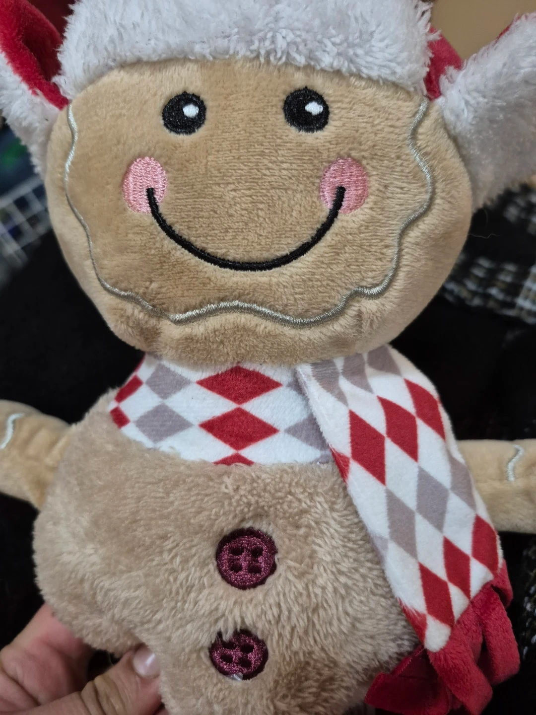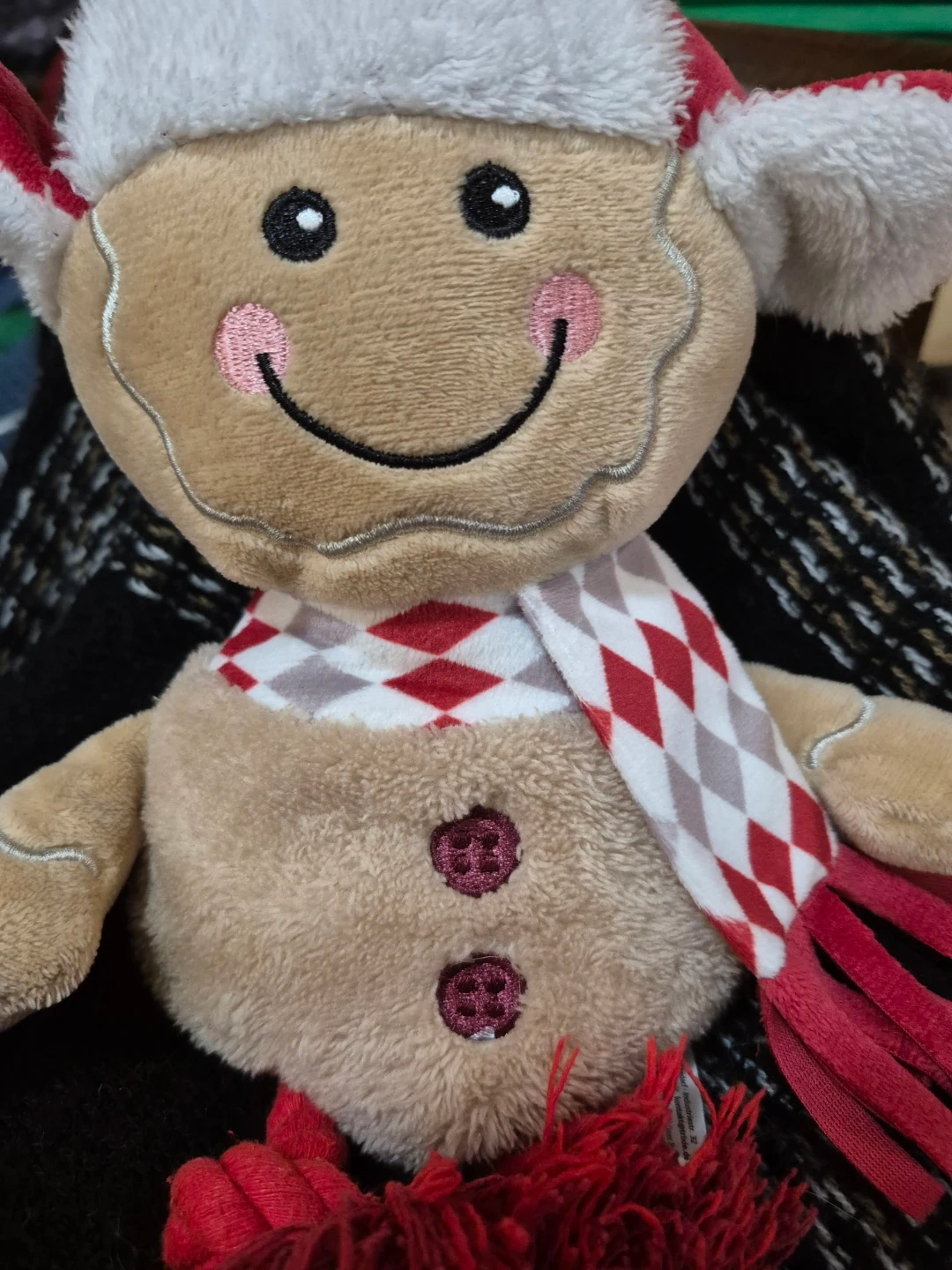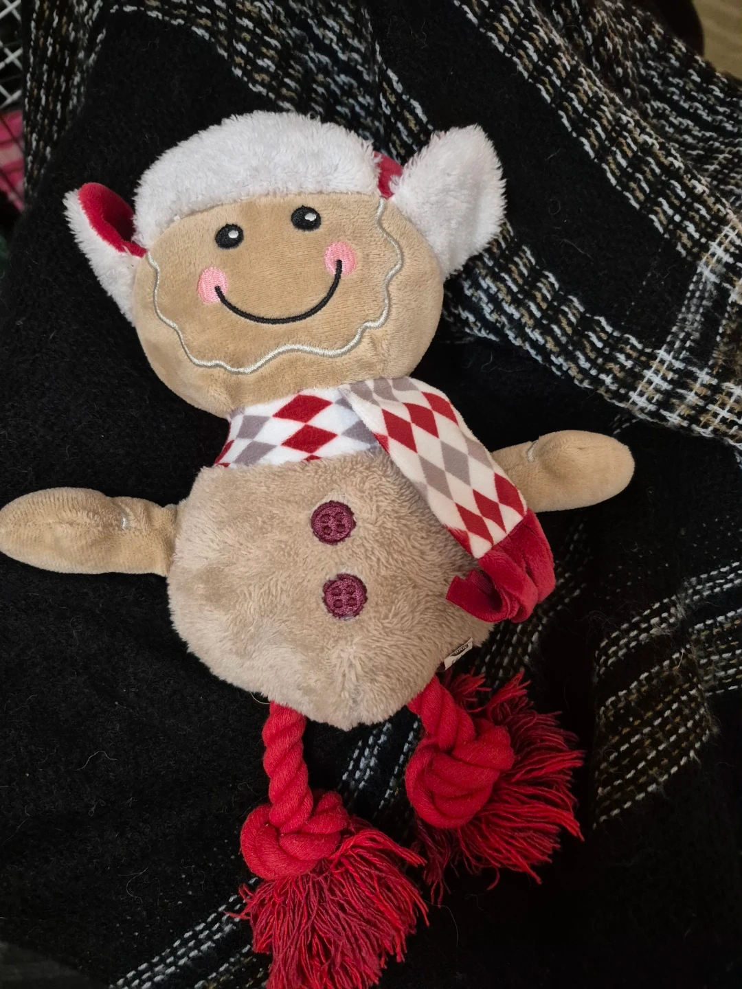 Super cute gingerbread man plush toy! Perfect for a medium or large dog. Features a festive red and white checkered scarf and fluffy white trim. Its legs are made of durable red rope, perfect for chewing or tugging.