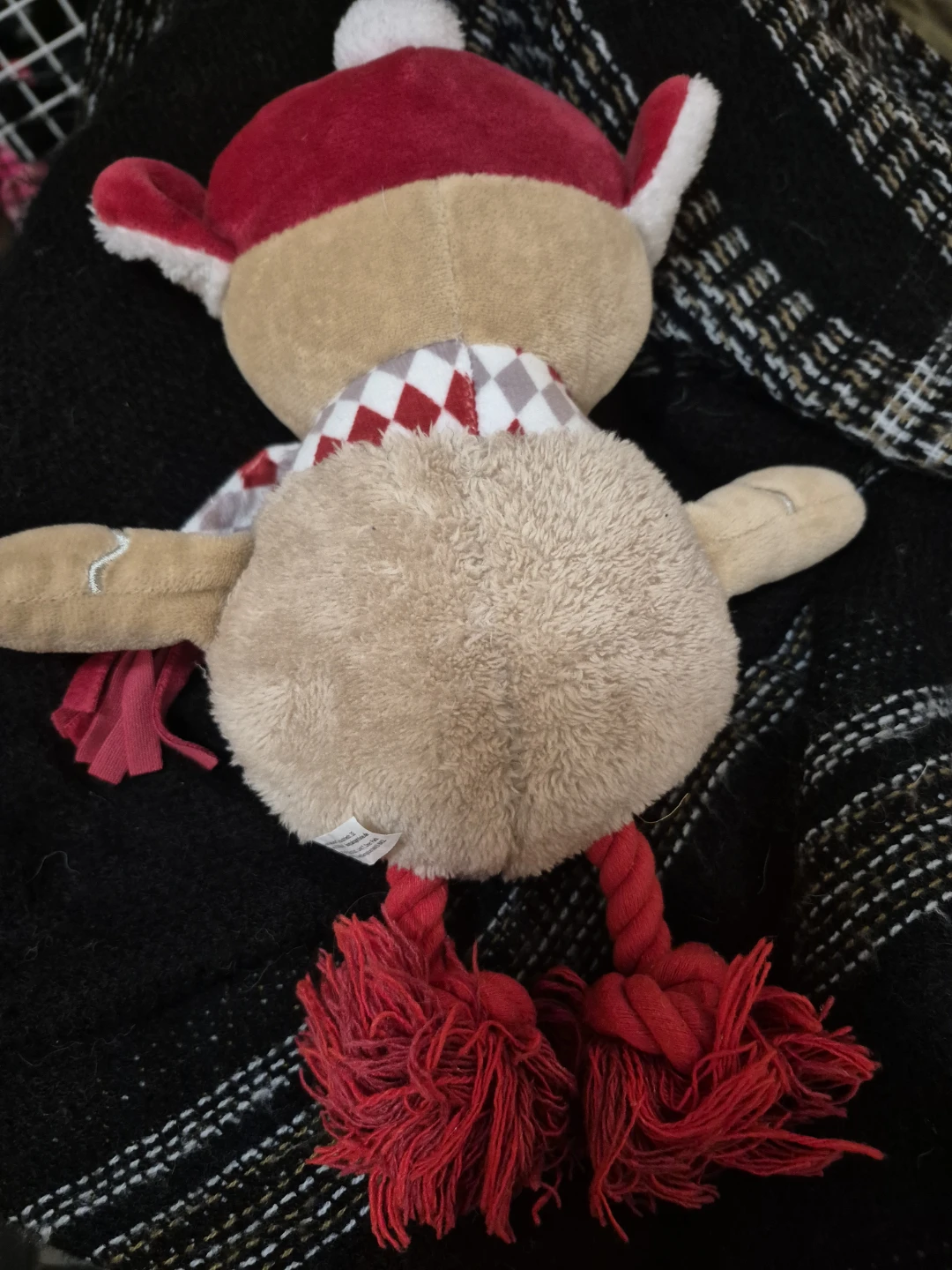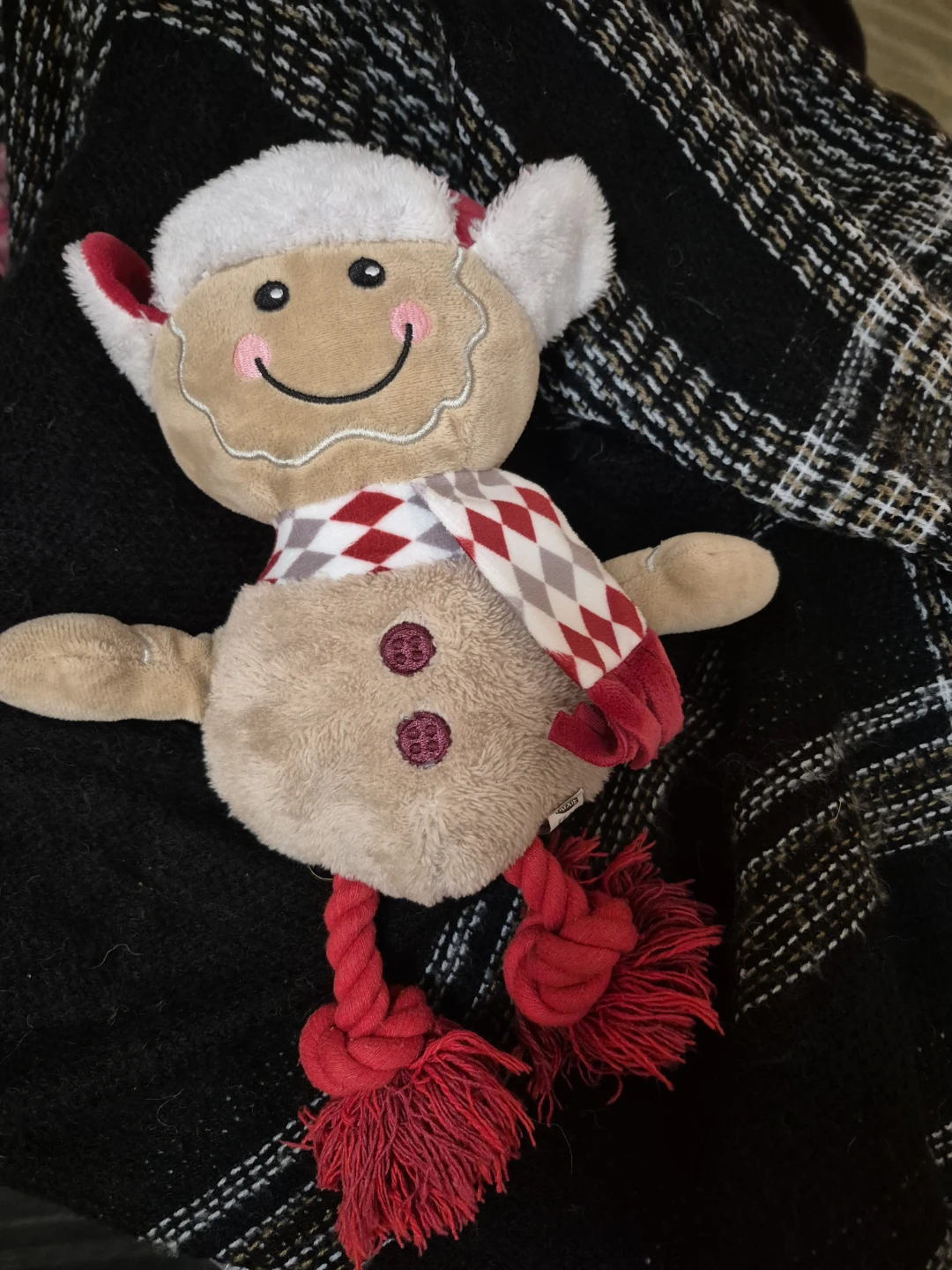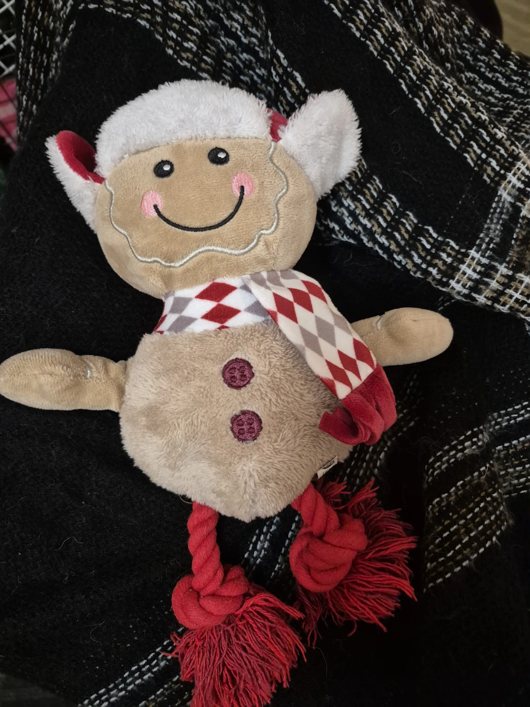 Super cute gingerbread man plush toy! Perfect for a medium or large dog. Features a festive red and white checkered scarf and fluffy white trim. Its legs are made of durable red rope, perfect for chewing or tugging.