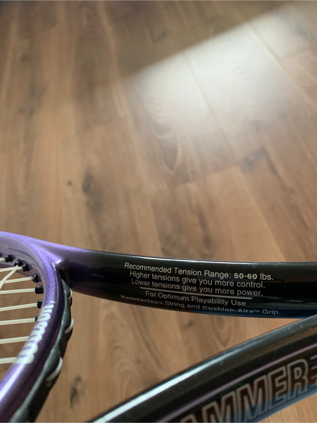 This Wilson Hammer Jr. tennis racket is great for youth players. It's purple and comes with a matching carrying case and additional purple tape for the handle. The recommended tension range is 50-60 lbs. for optimum playability.
