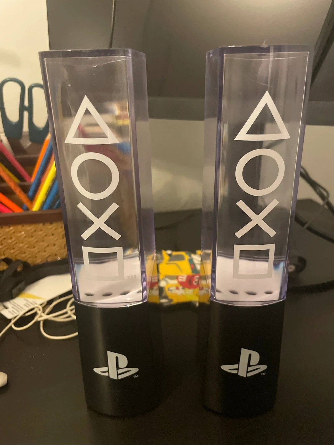 This set includes two desk lamps featuring the iconic PlayStation controller buttons. They have a black base with the PlayStation logo and a clear acrylic top displaying the symbols. Perfect for a gamer's desk or room!