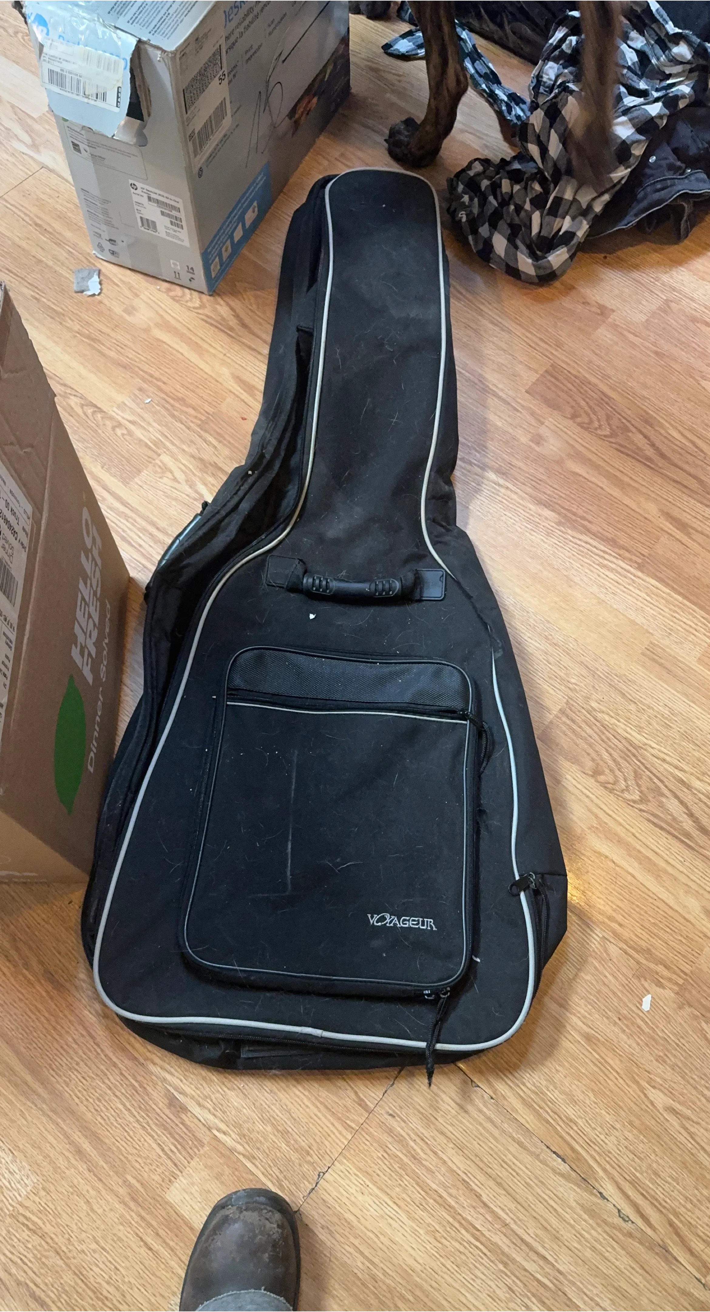 Black Voyageur gig bag for guitar. It's made of durable material and features a large front pocket for accessories. This bag offers protection for your instrument while on the go.