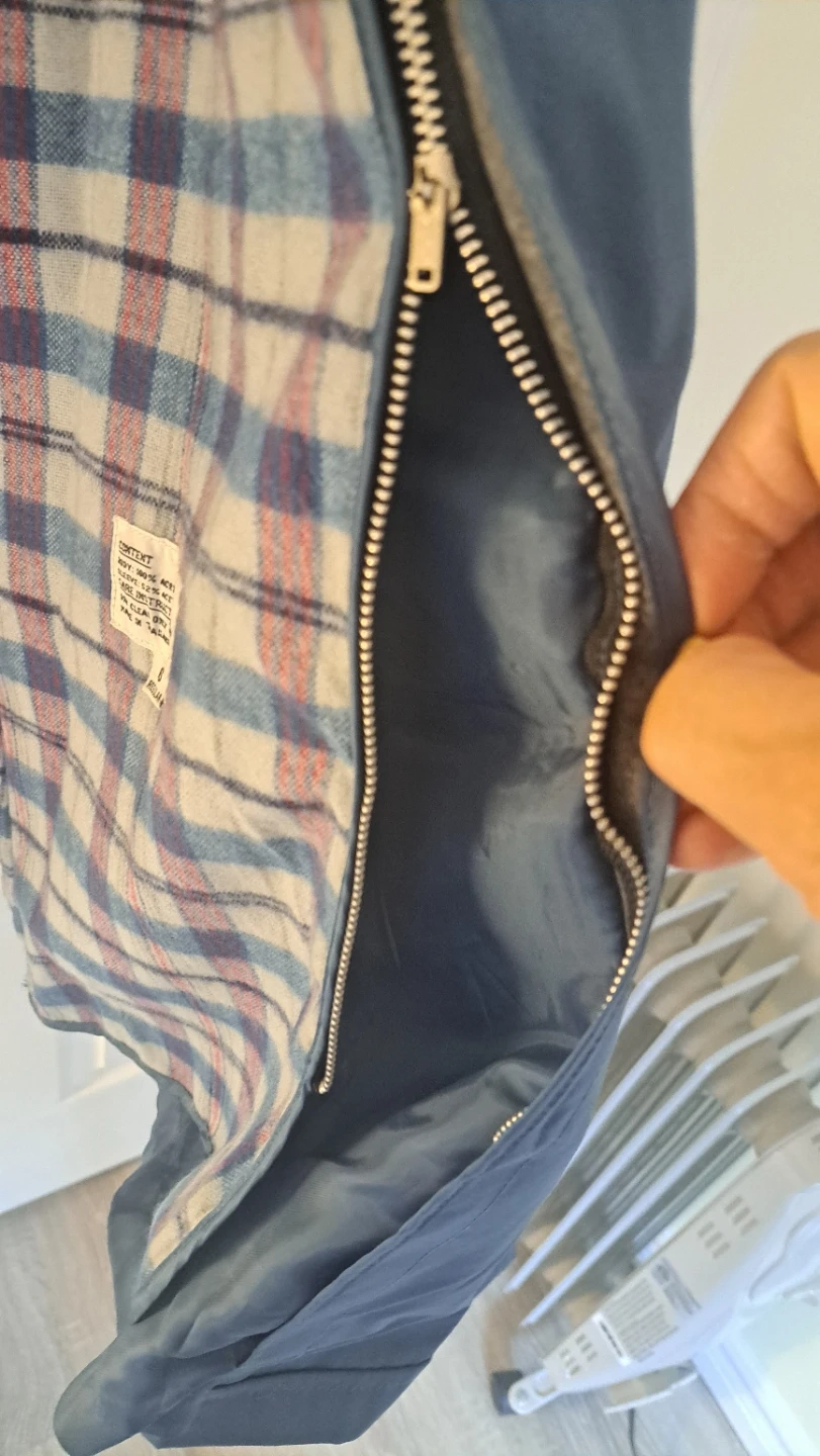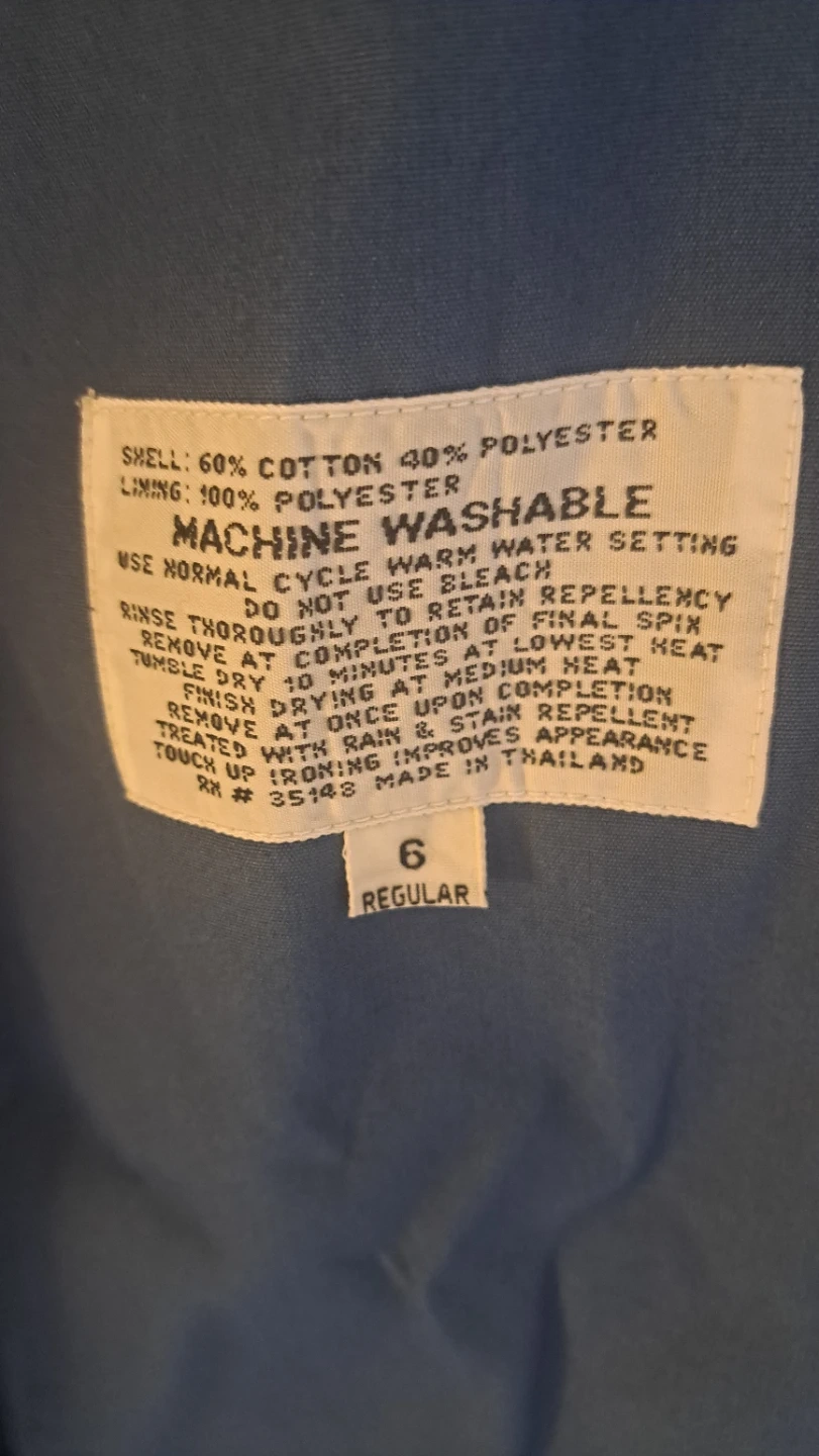 This is a 2 in 1 Misty Harbor women's trench coat. Shell is 60% cotton and 40% polyester, lining is 100% polyester. It's machine washable on a normal cycle with warm water. This coat has a removable(zipper-off) lining and comes with a tie belt.