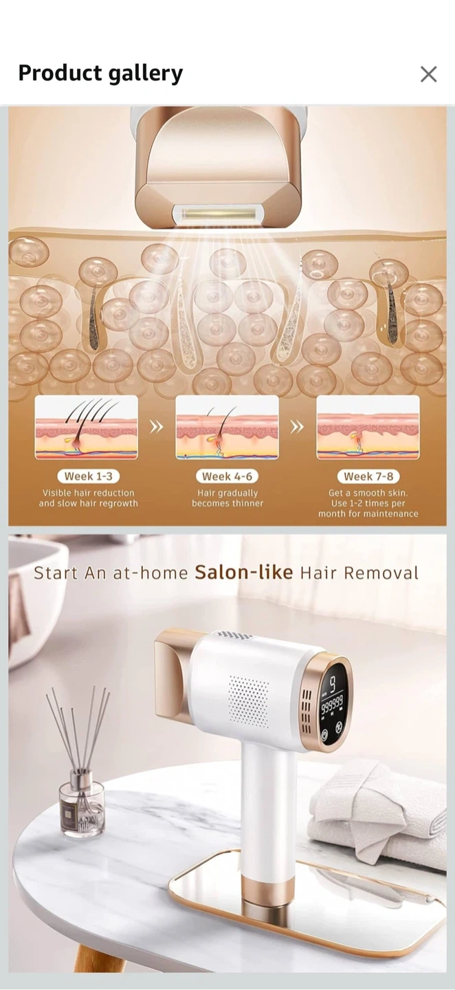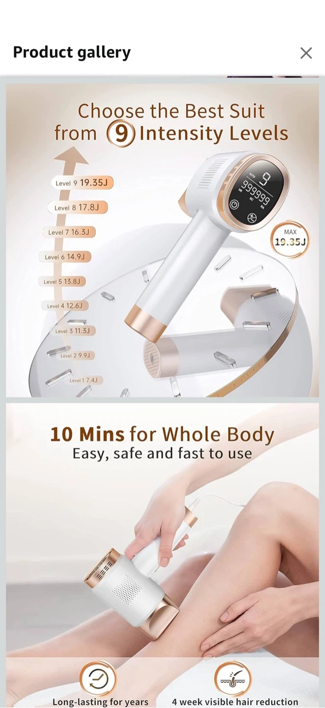 This IPL hair removal device offers 3 functional modes for hair removal, skin rejuvenation, and acne reduction. It features 9 intensity levels up to 19.35J and 999999 flashes. This at-home salon-like hair removal system provides visible hair reduction and slow hair regrowth. It's designed for easy, safe, and fast use on the whole body.