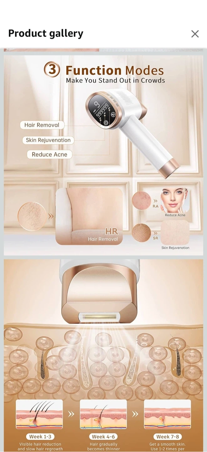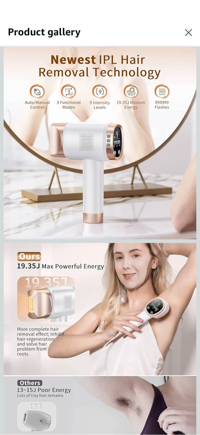 This IPL hair removal device offers 3 functional modes for hair removal, skin rejuvenation, and acne reduction. It features 9 intensity levels up to 19.35J and 999999 flashes. This at-home salon-like hair removal system provides visible hair reduction and slow hair regrowth. It's designed for easy, safe, and fast use on the whole body.