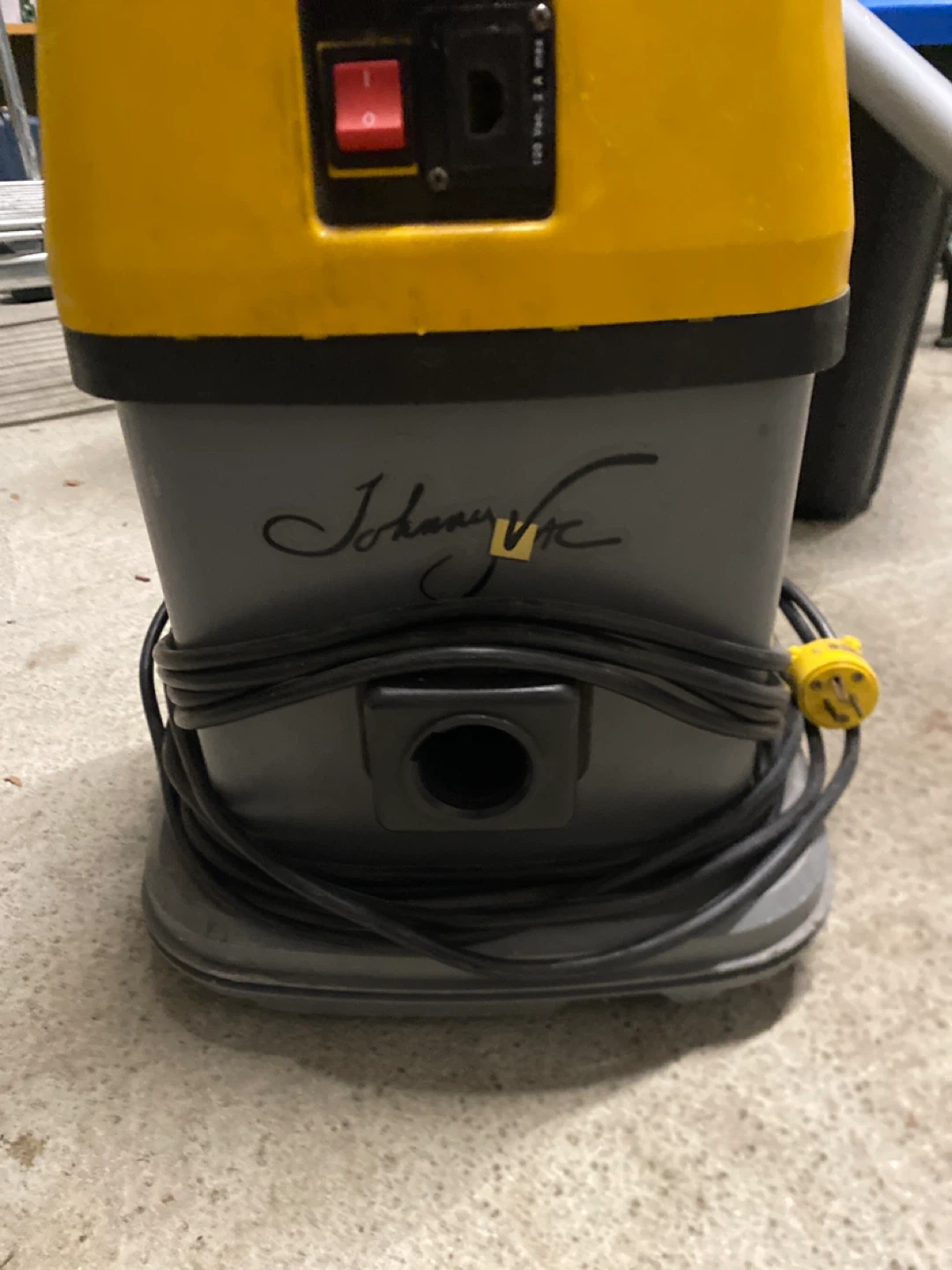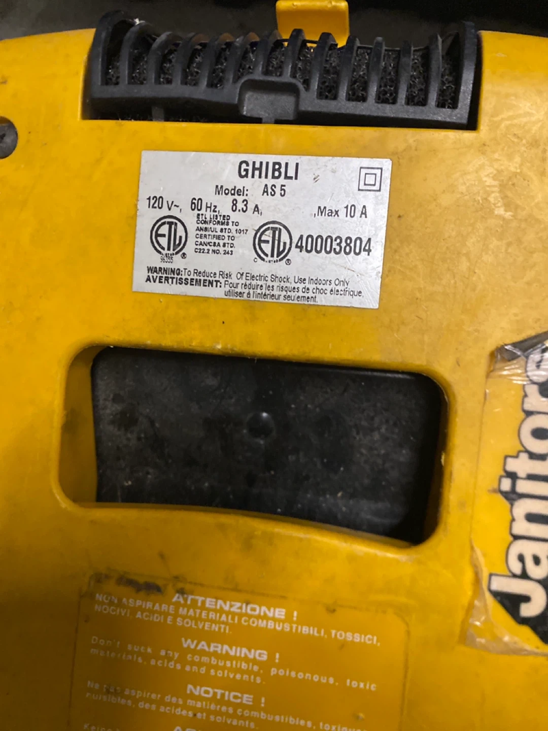 This is a Ghibli AS 5 vacuum cleaner. It's yellow and grey. Includes floor tool. 120V, 60 Hz, 8.3 A, Max 10 A.