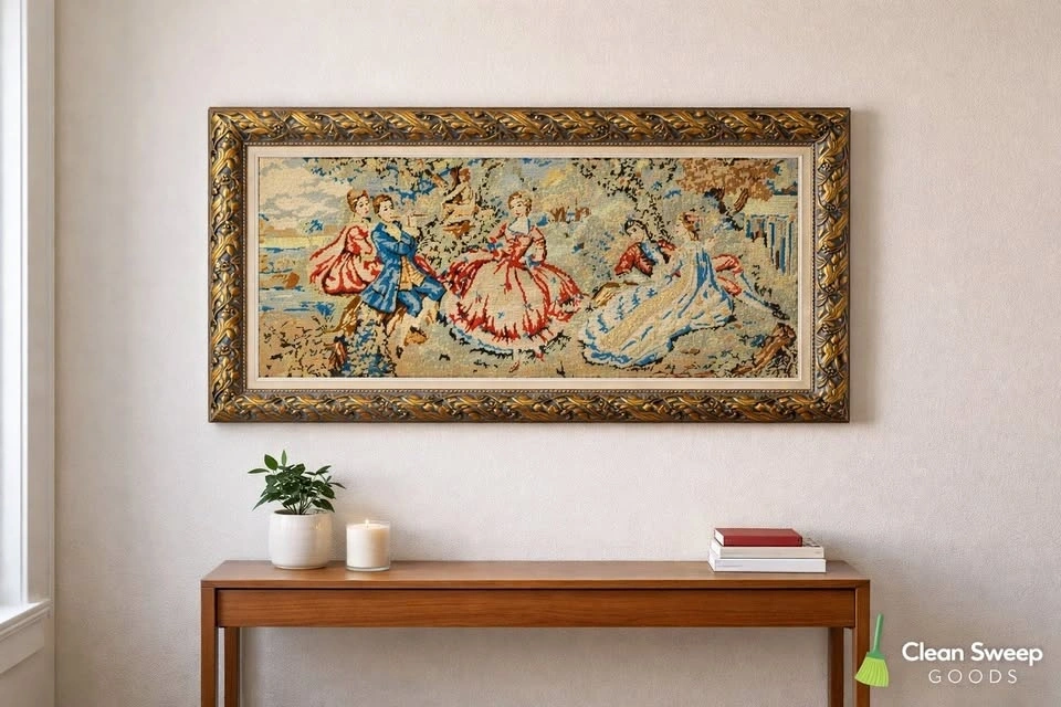 A fresh find, rescued and cleaned, ready for a new home. Classic vintage-style tapestry artwork featuring a charming outdoor scene with elegantly dressed figures. Large statement piece with a bold, ornate frame – perfect for adding character to a wall. Best suited as decorative wall art. Good overall condition. Cleaned and ready to use. Front displays well. Back shows visible threadwork and loose stitching typical of this style, but does not affect display when hung. I rescue perfectly good items, clean them up, fix anything that needs a little love, and send them back into the world instead of the landfill. Richmond Hill pickup.