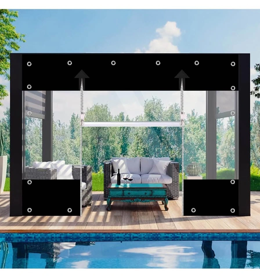 Clear Tarps with Zipper Door, Heavy Duty PVC Transparent Tarpaulin Side Panels, Tarpaulin Rain Curtains for Outdoor Pergola Garden Gazebo (Black, 7'HX10'W)