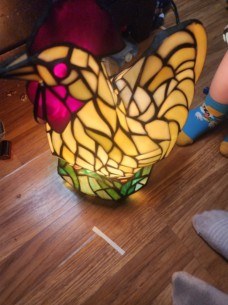 This is a beautiful Tiffany style lamp shaped like a chicken! The stained glass design gives off a warm and inviting glow. It's a unique piece that would add character to any room