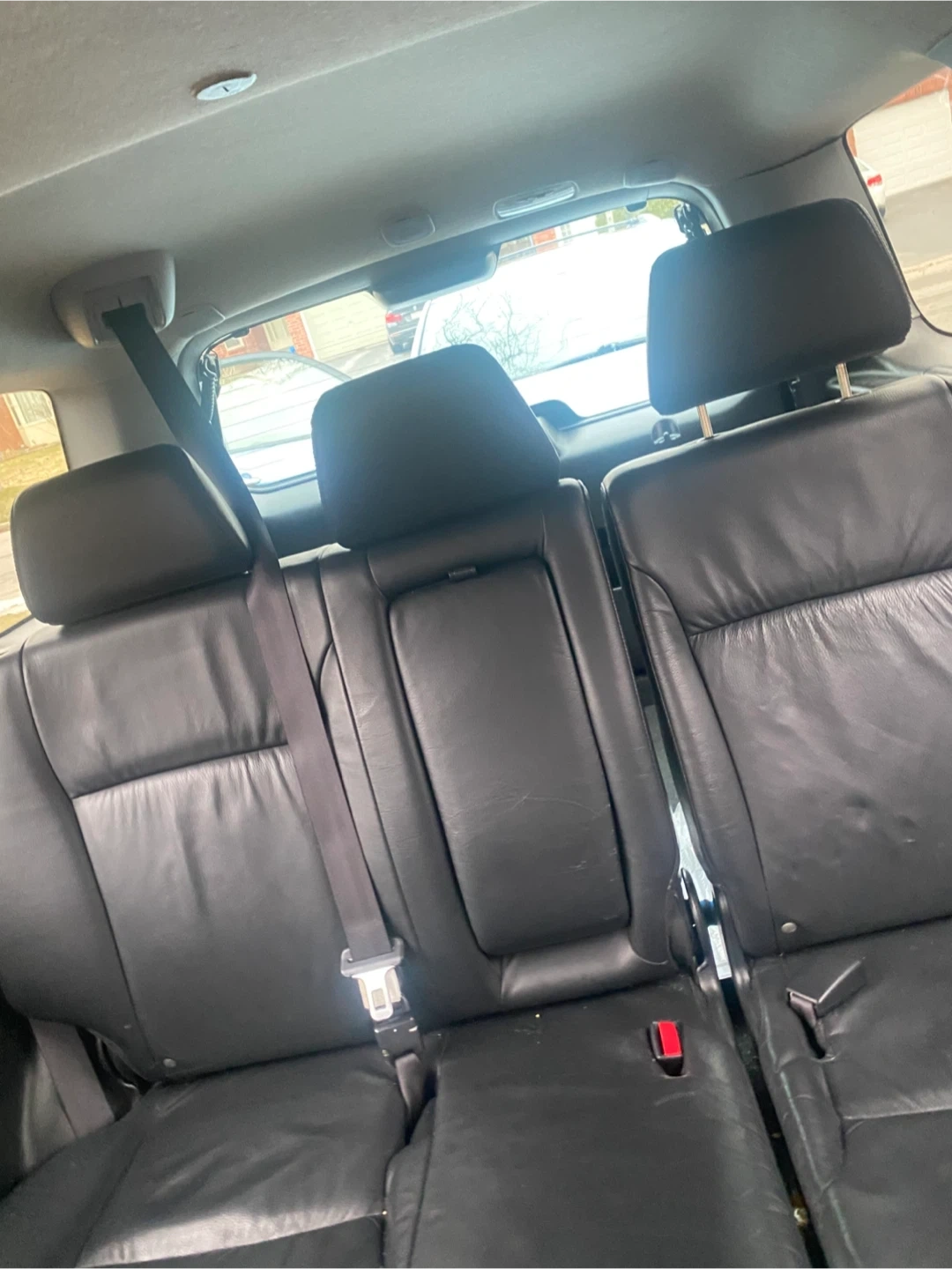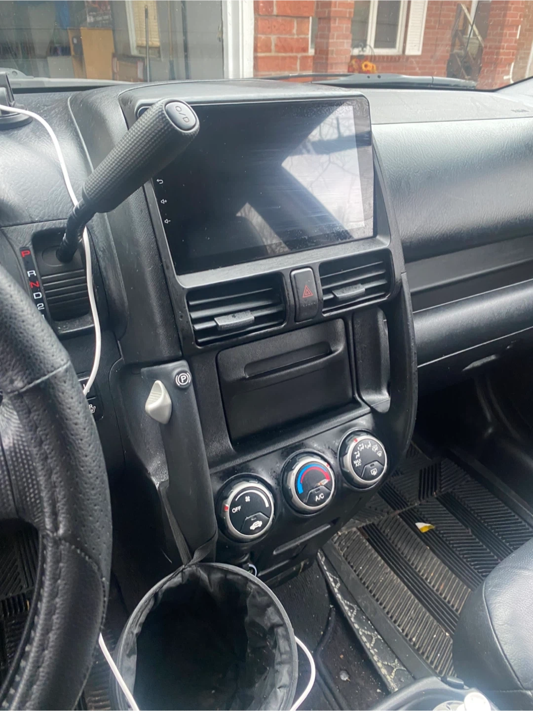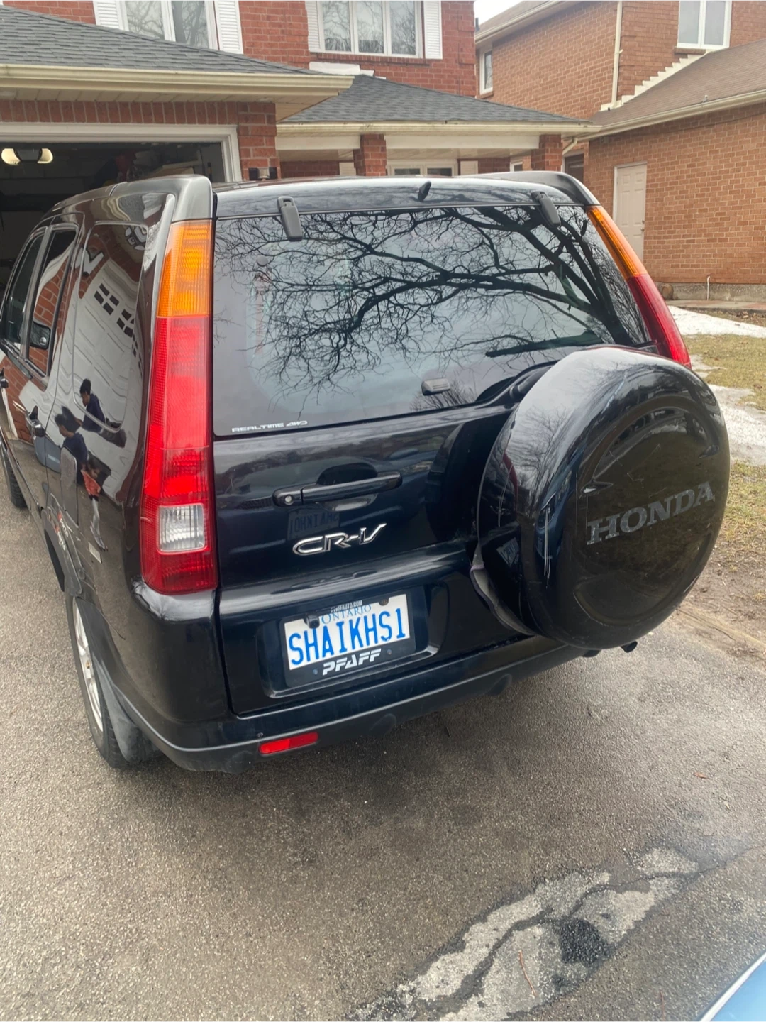 This black Honda CR-V Sport SUV features black leather interior. It's a reliable vehicle for daily commutes and family trips. It's seen some wear and tear, especially on the driver's seat.