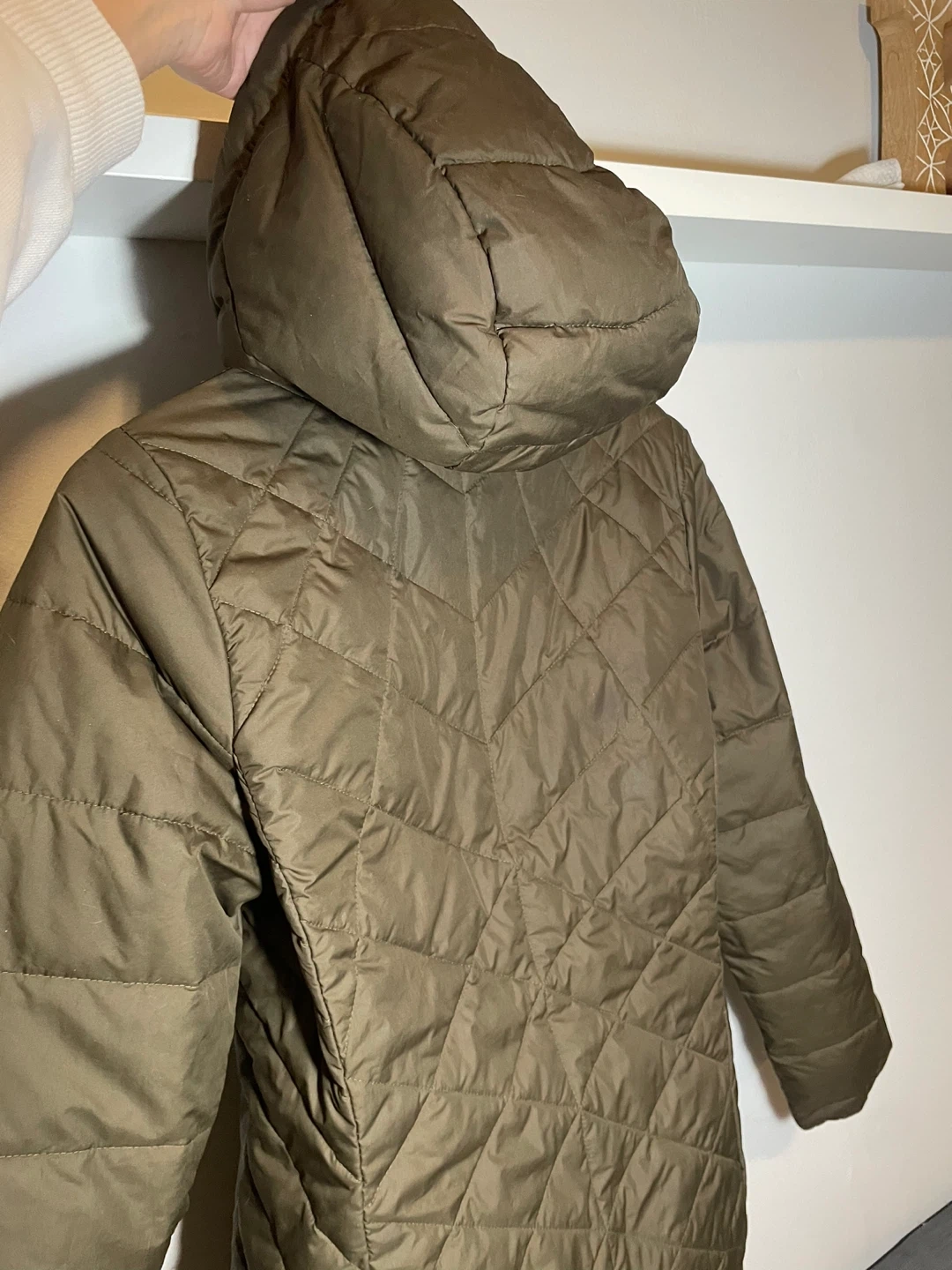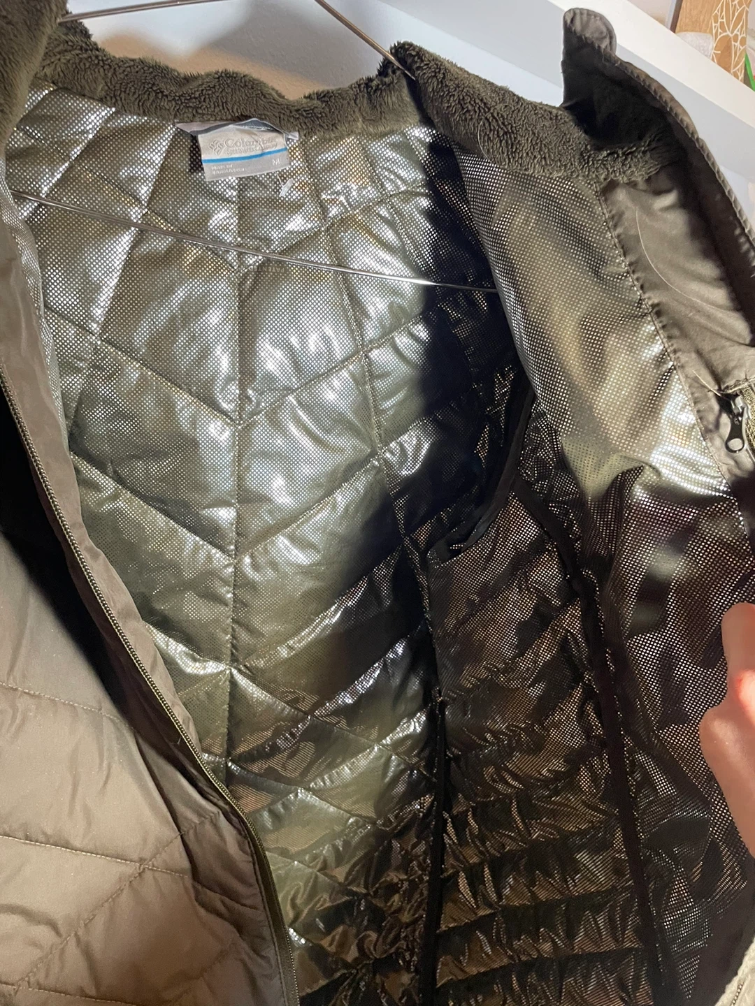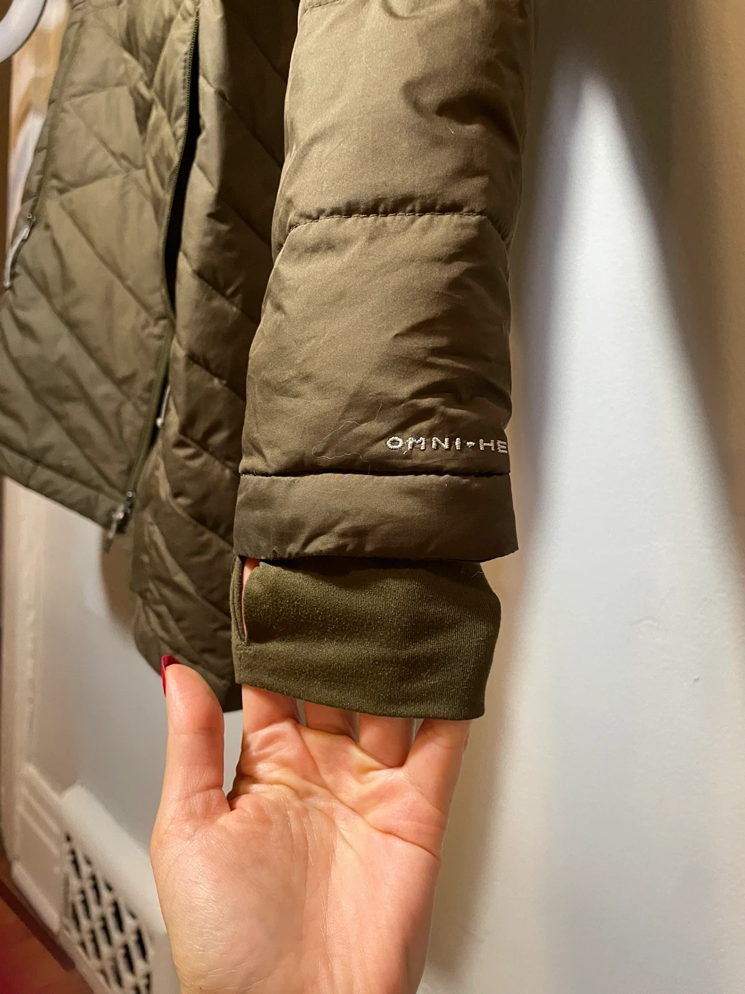 This is a Columbia puffer jacket in olive green, size medium. It has a hood and a quilted design. There are a few small marks on the front, as shown in the photos, but otherwise it's in good condition!