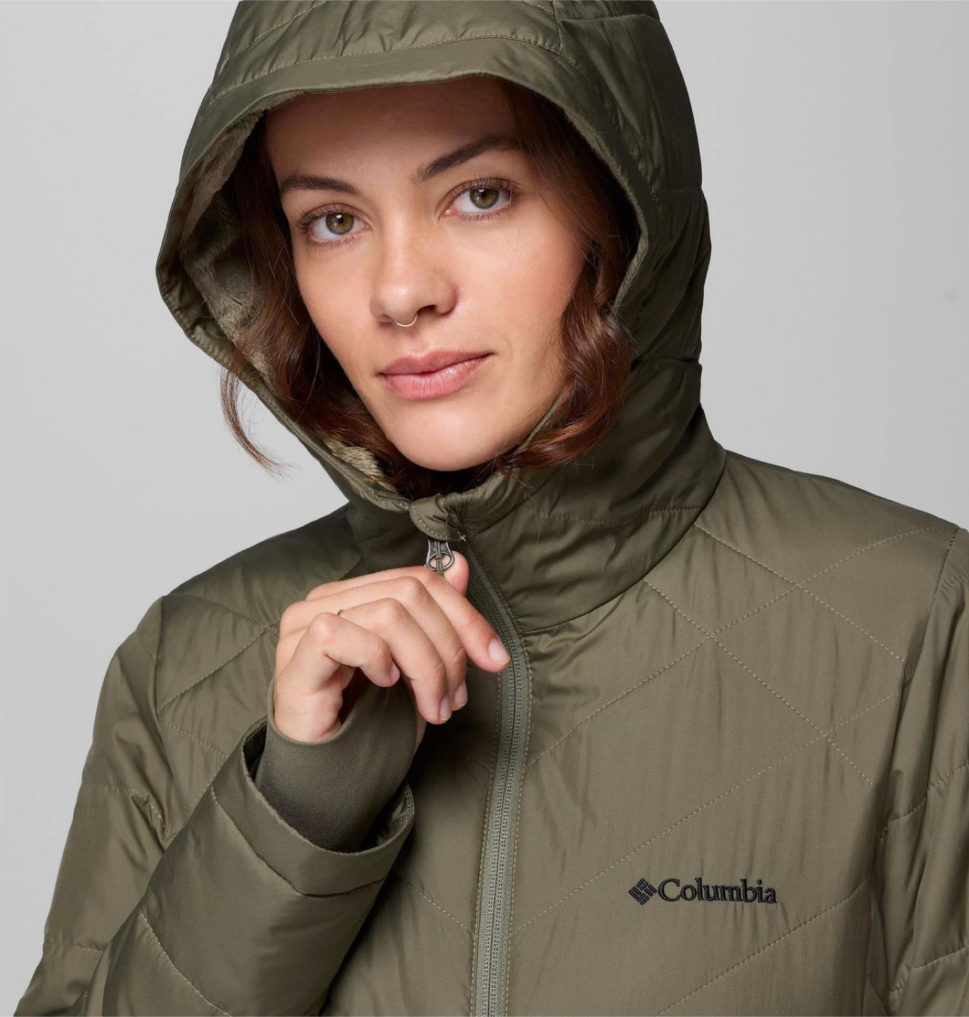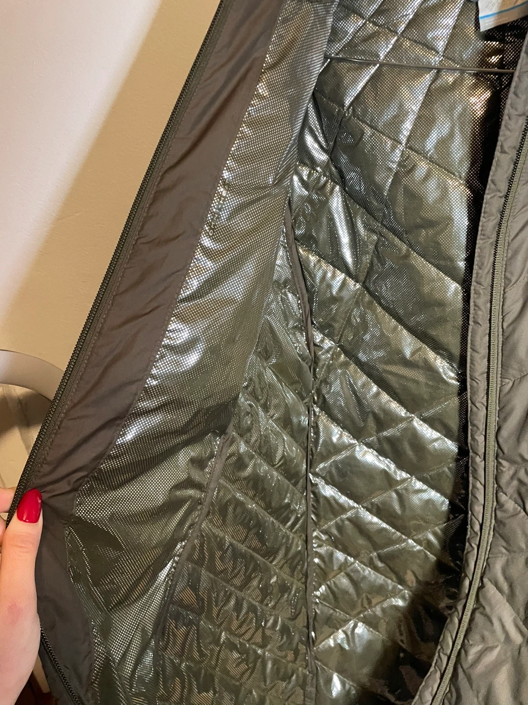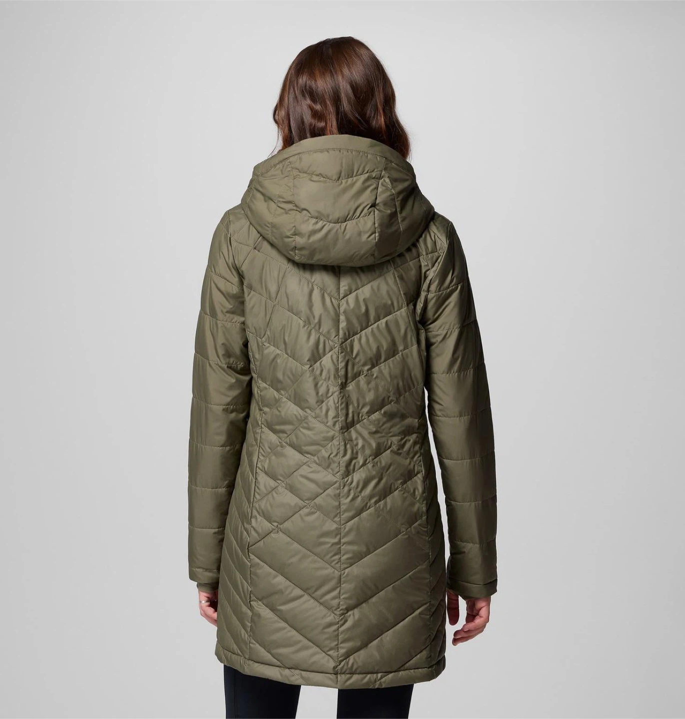 This is a Columbia puffer jacket in olive green, size medium. It has a hood and a quilted design. There are a few small marks on the front, as shown in the photos, but otherwise it's in good condition!