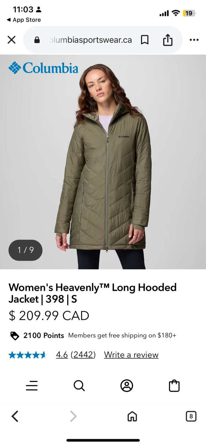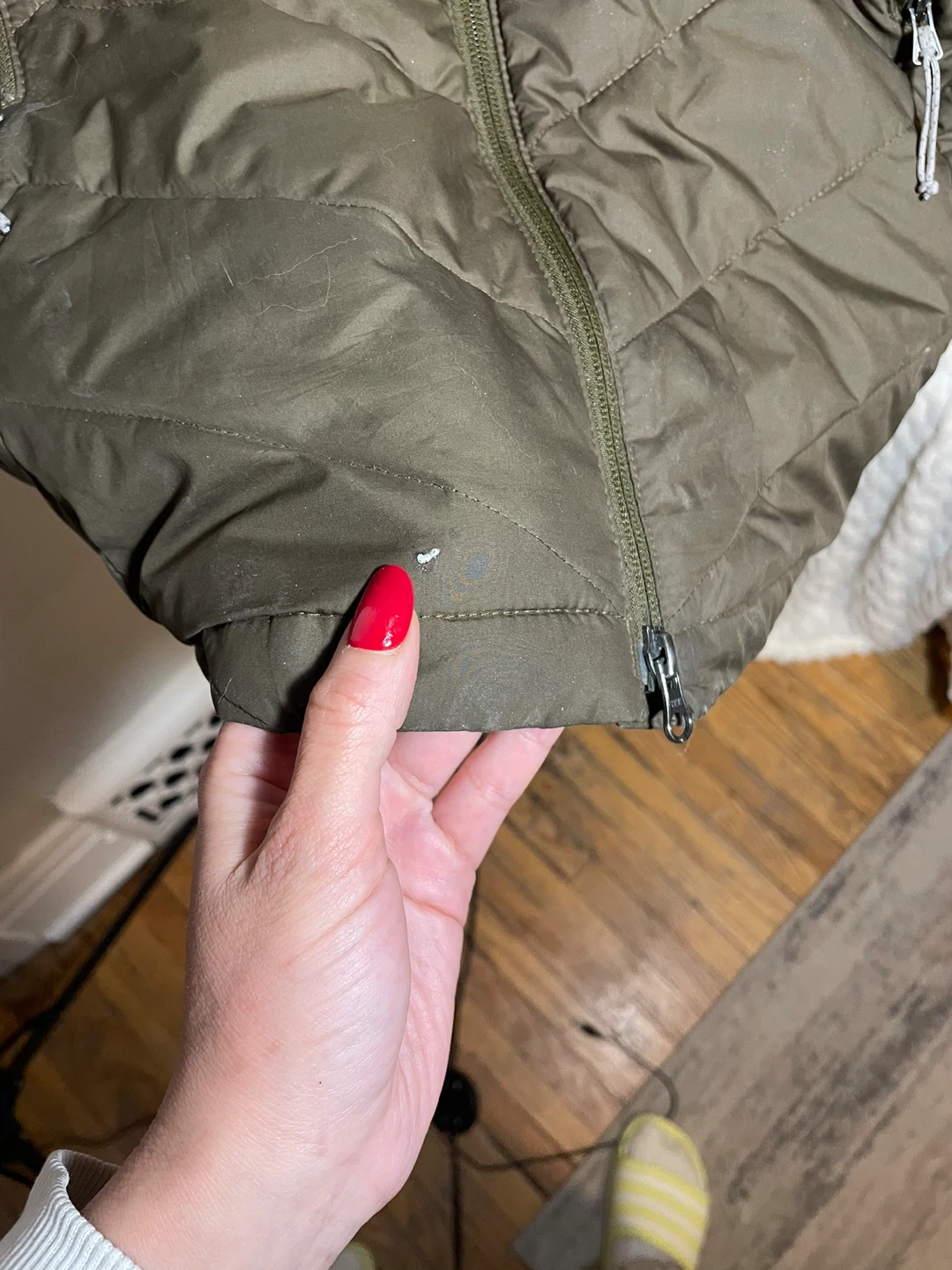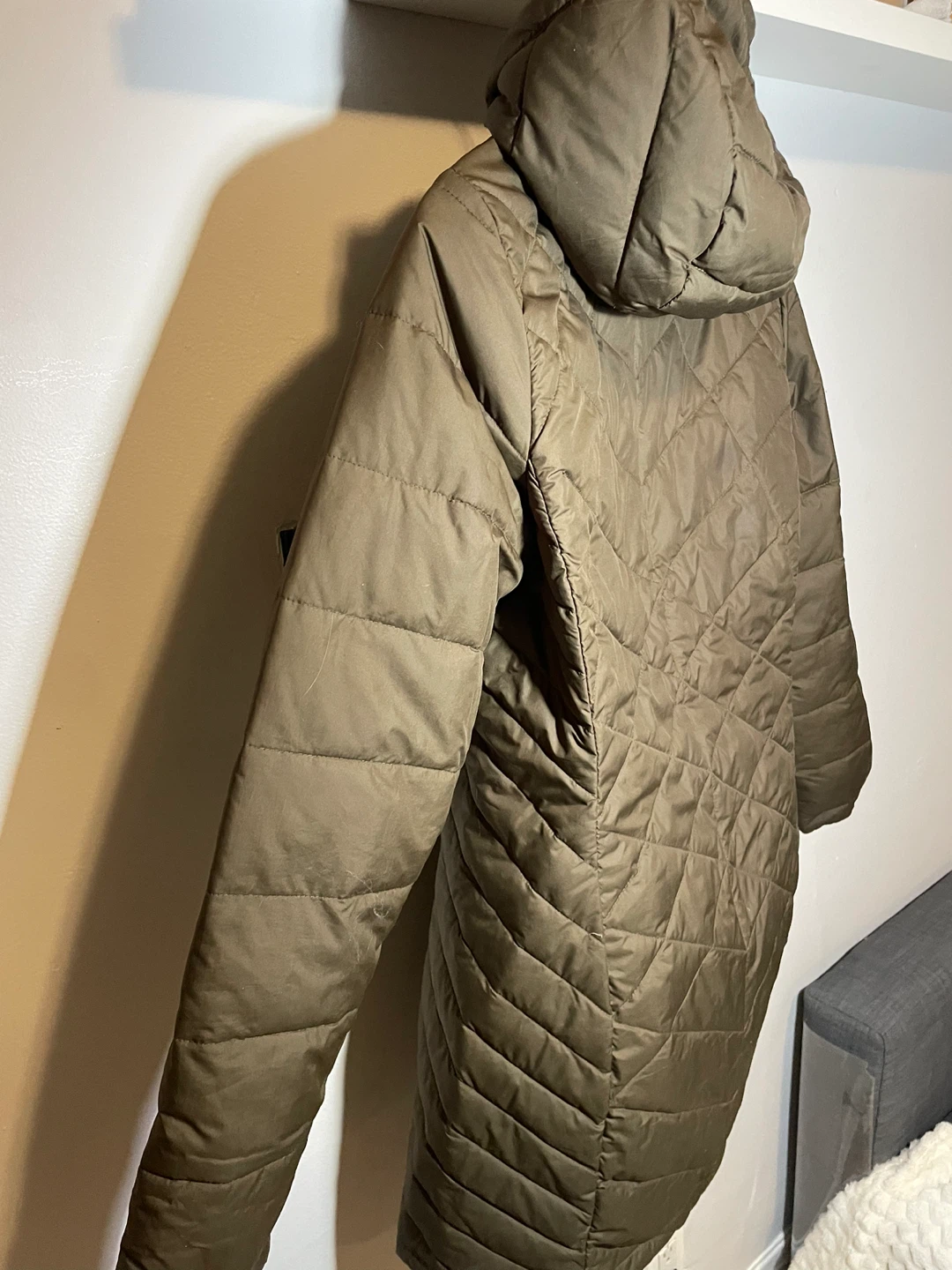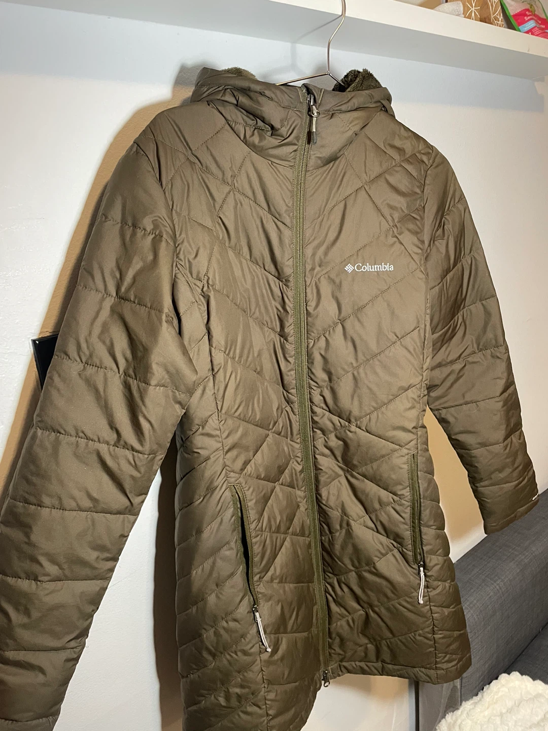 This is a Columbia puffer jacket in olive green, size medium. It has a hood and a quilted design. There are a few small marks on the front, as shown in the photos, but otherwise it's in good condition!
