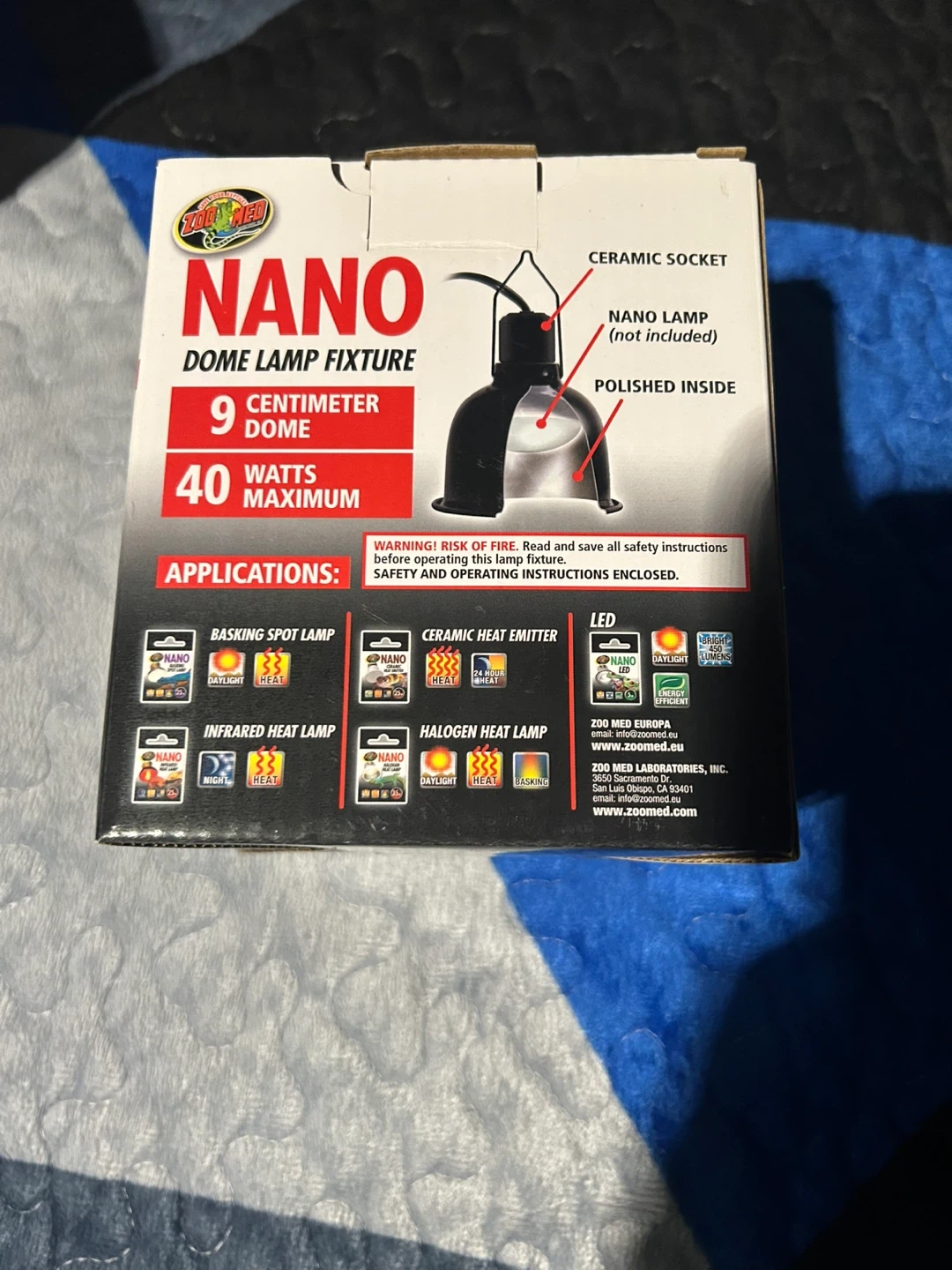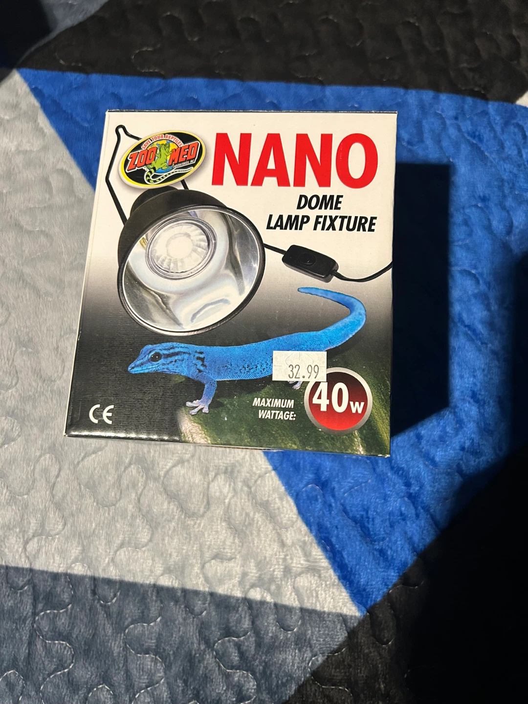 This is the Zoo Med Nano Dome Lamp Fixture. It has a 9 centimeter dome. It supports a maximum wattage of 40 watts. It's designed for reptile basking and heat lamps.