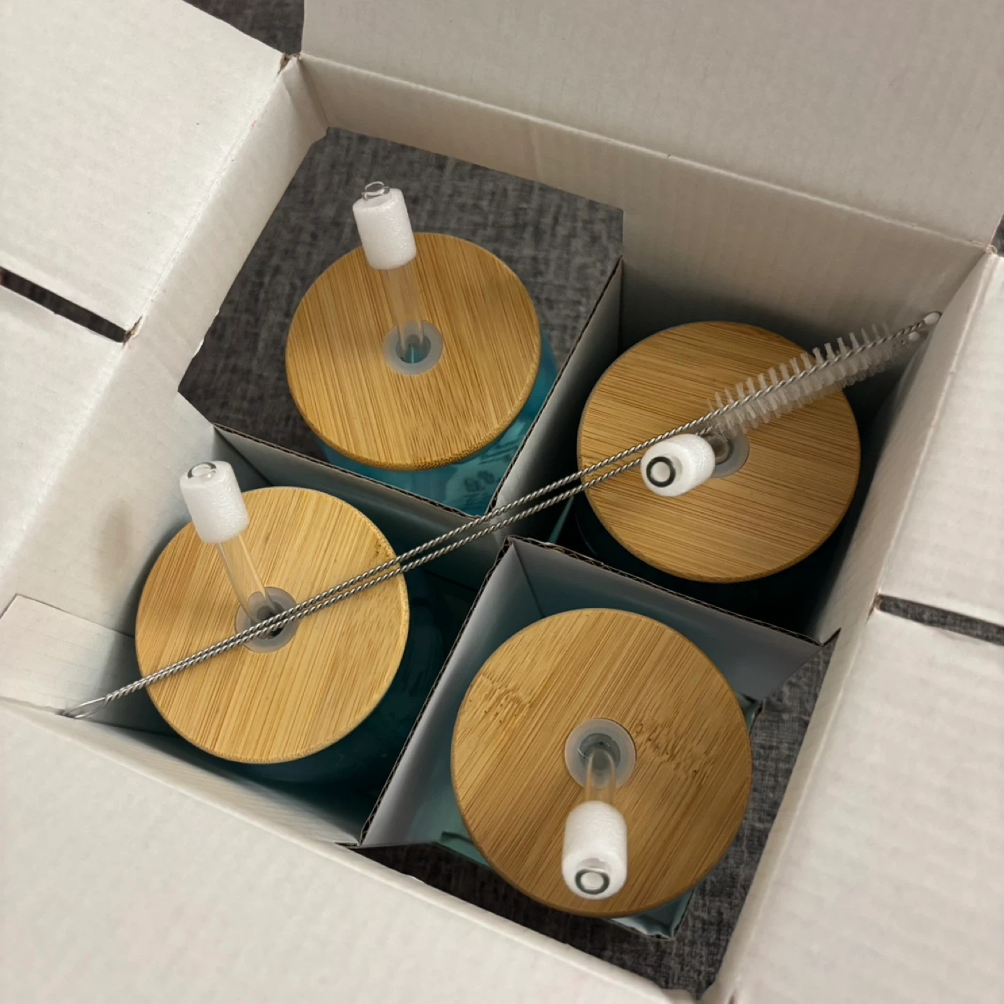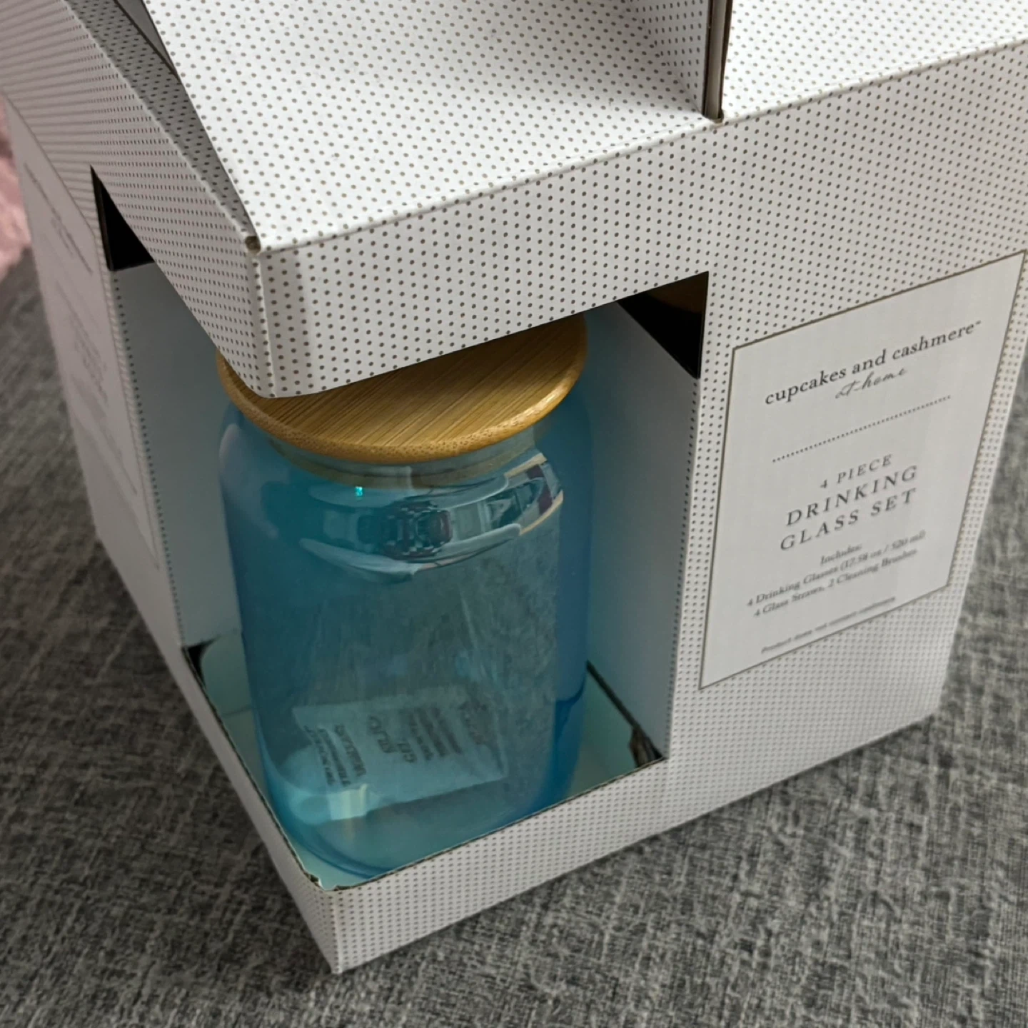 This is a set of 4 drinking glasses from Cupcakes and Cashmere. Each glass is 17.58 oz / 520 ml and includes a bamboo lid and glass straw. It also comes with 2 cleaning brushes. This set is great for enjoying your favourite beverages!