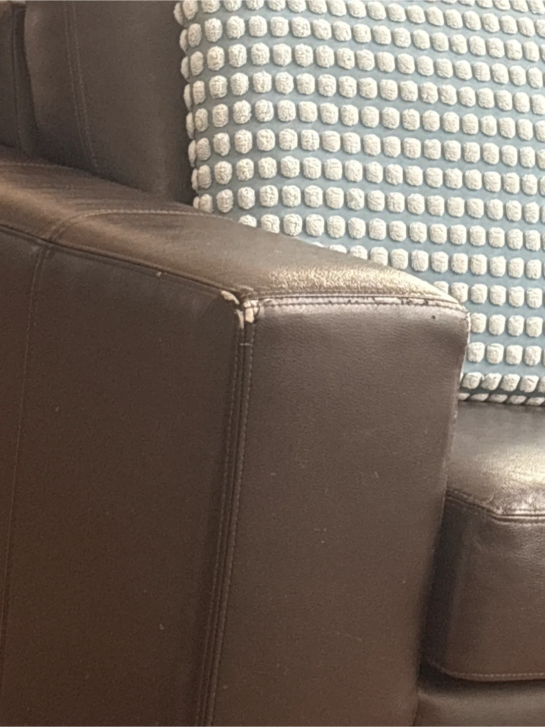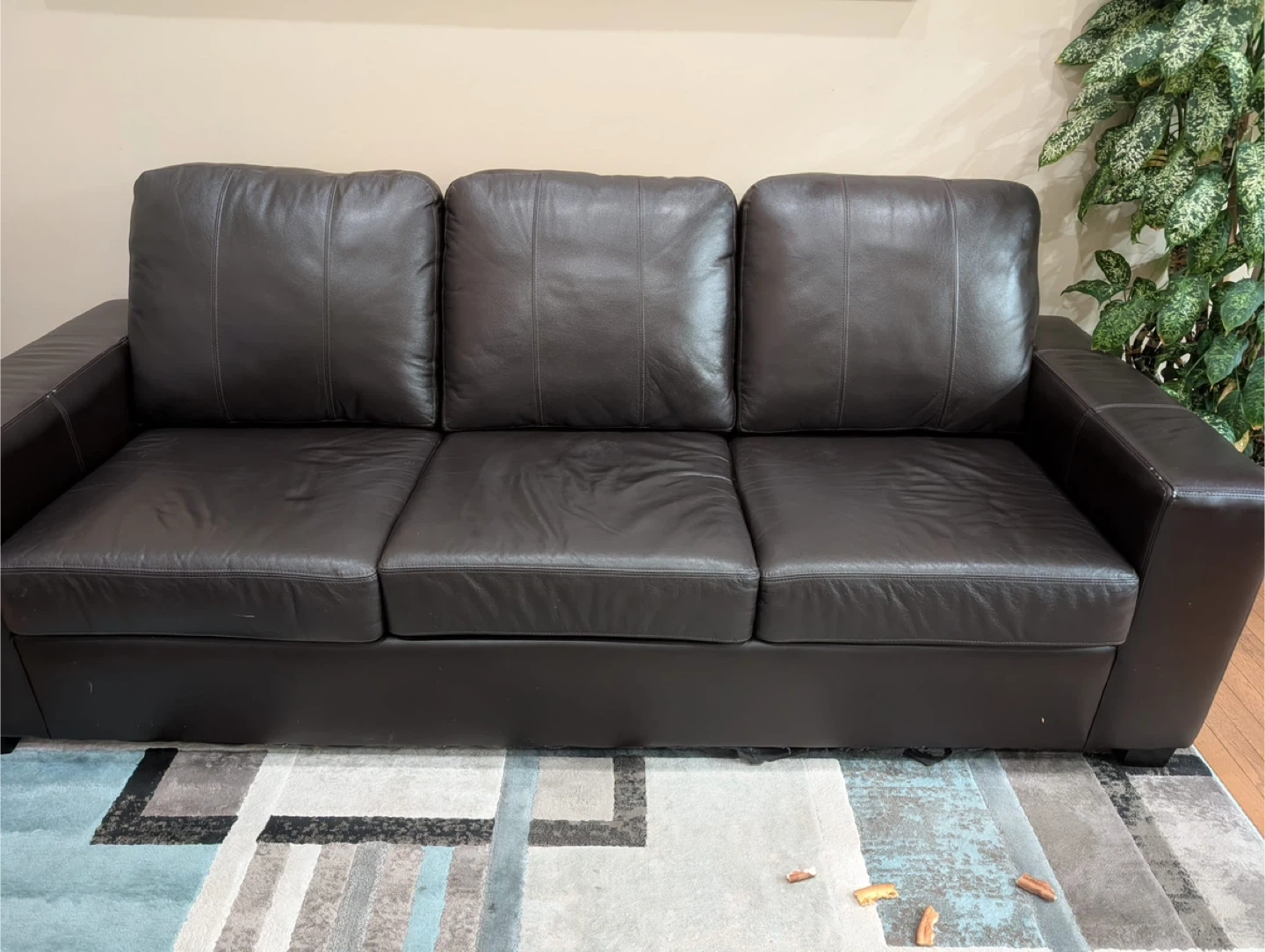 A dark brown leather sofa with three seat cushions. It's made of genuine leather and has a sturdy frame. This sofa provides ample seating for a family or guests. There are 2 sofa and one sofa has little lit of wear out marks .