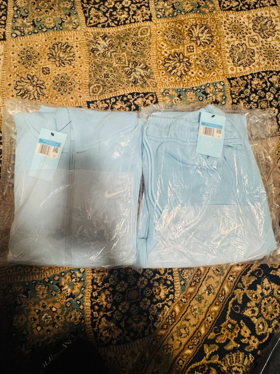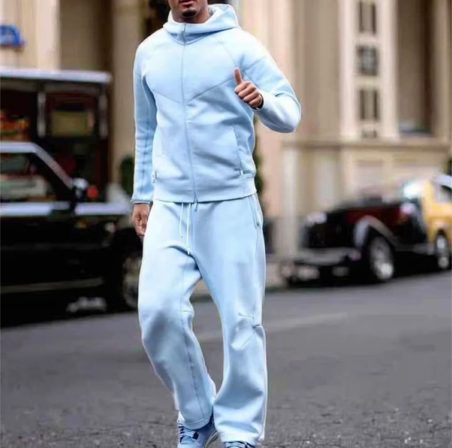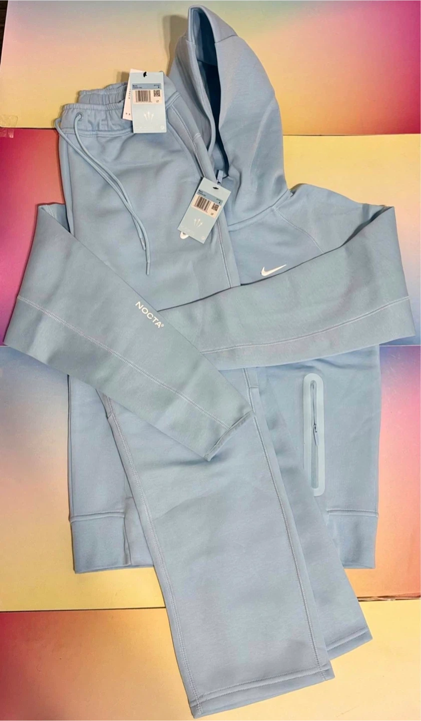 This is a baby blue Nike NOCTA tracksuit set. It includes a zip-up hoodie and matching pants. Both pieces are made of a comfortable fabric blend.