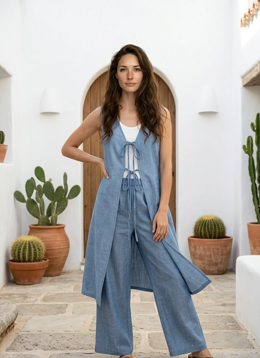 This women's set includes a long, sleeveless vest and wide-leg pants. It's made from a breathable linen blend fabric. The vest features a tie-front closure and the pants have a comfortable elastic waistband.