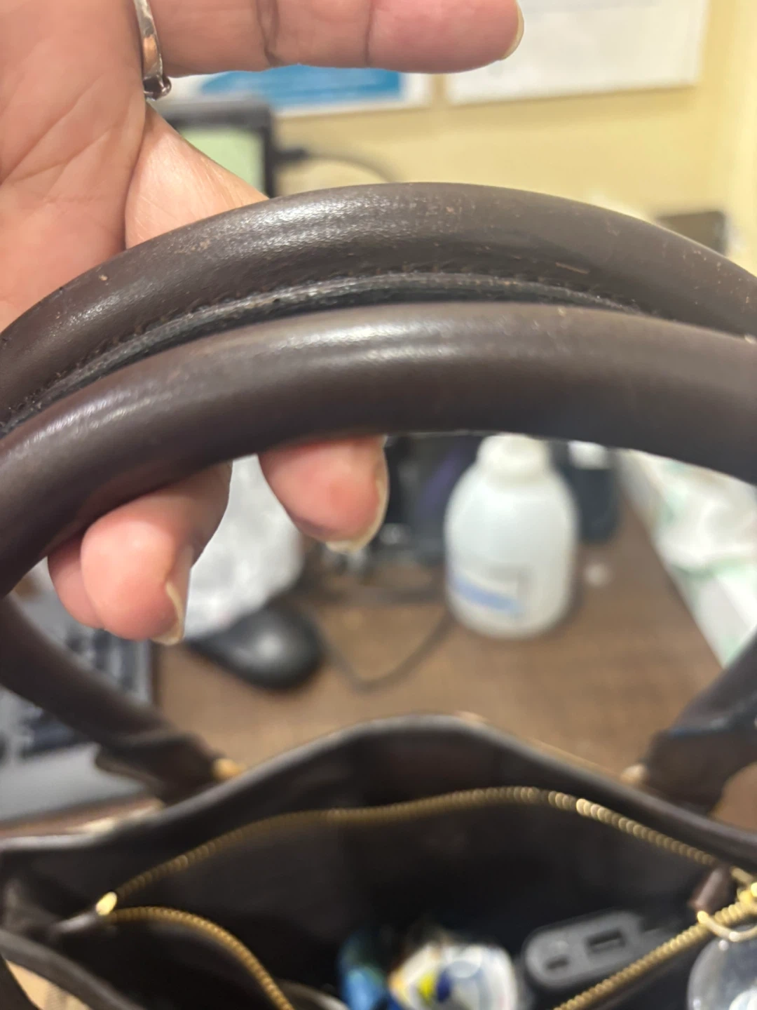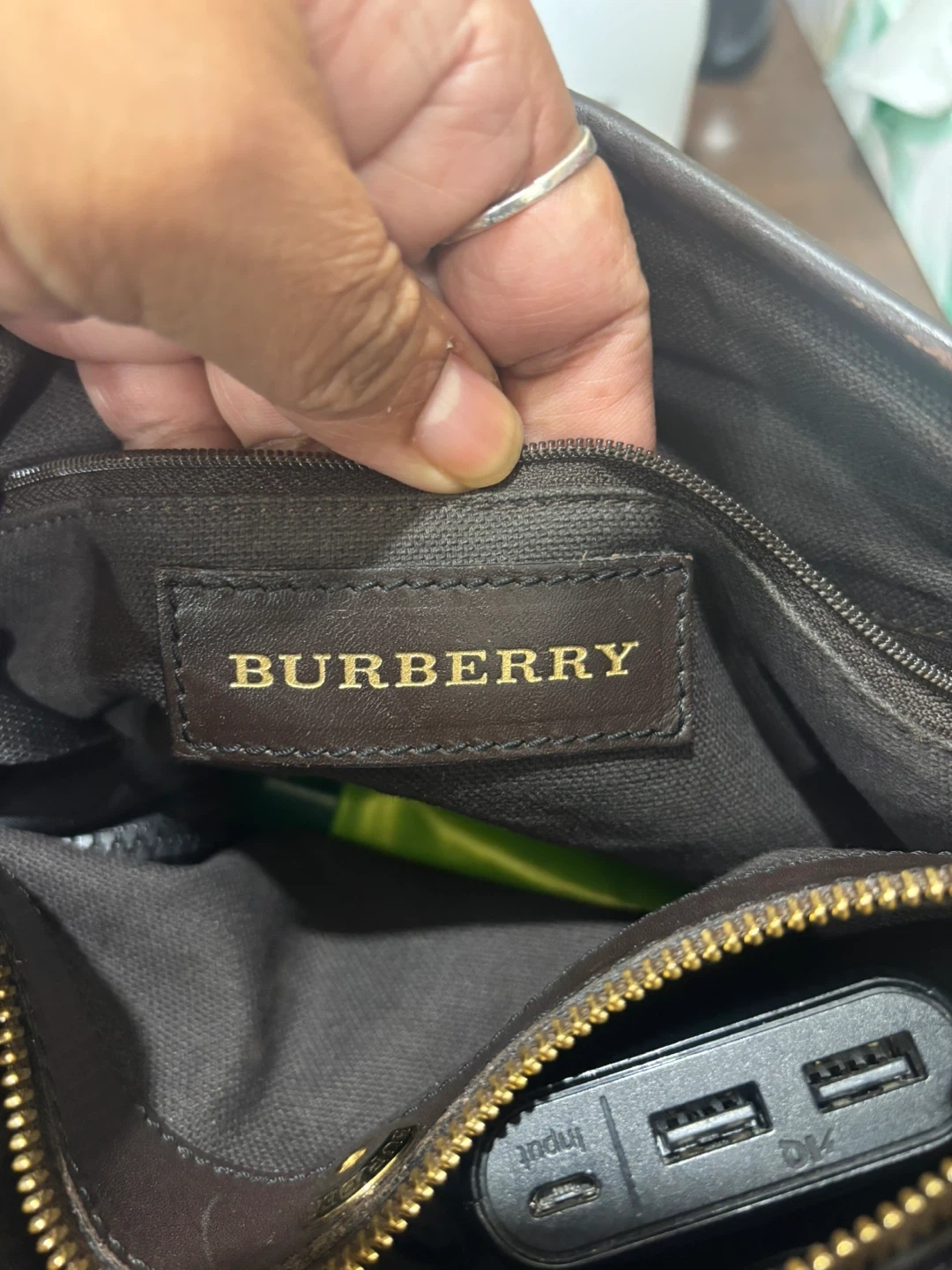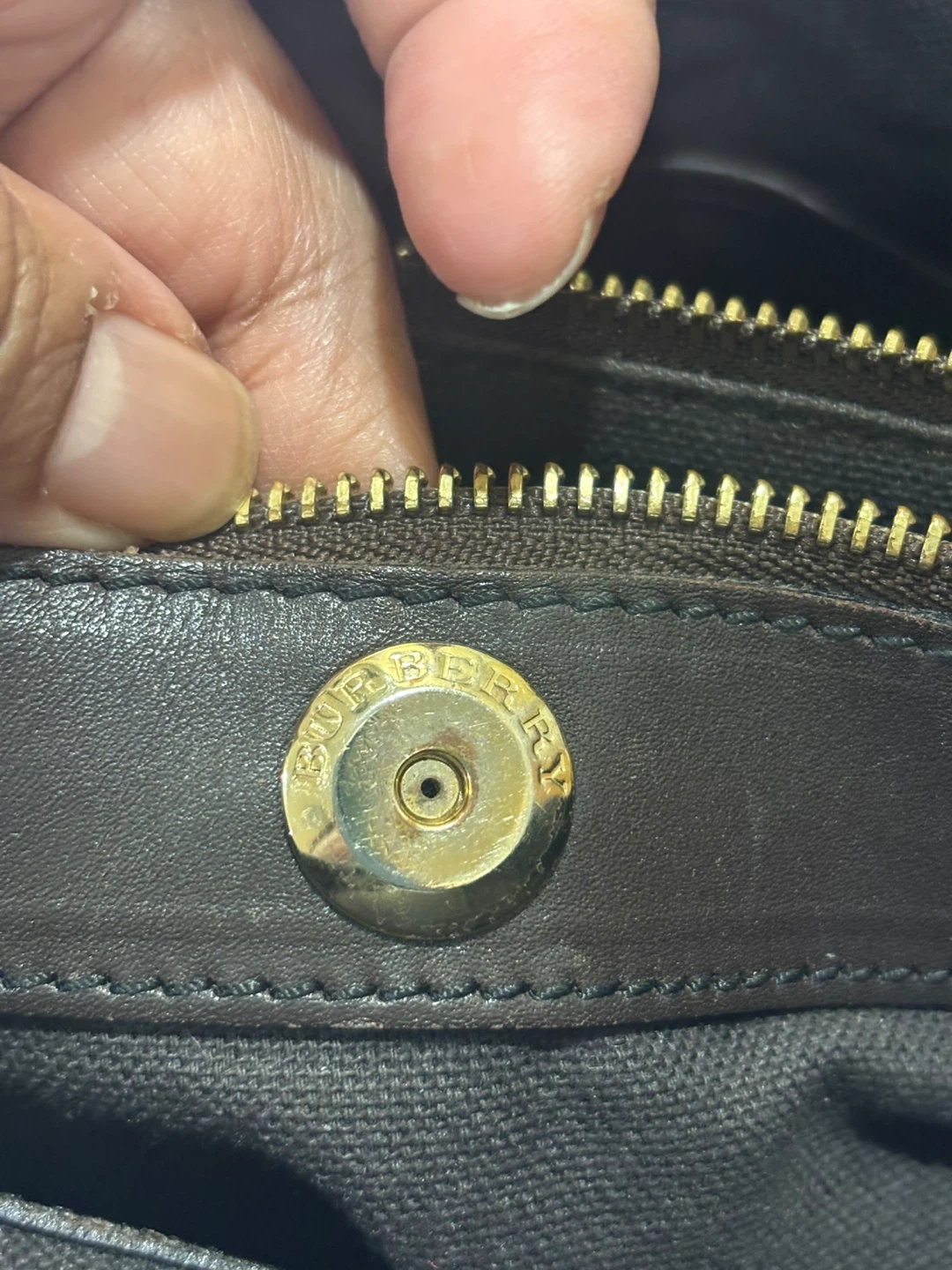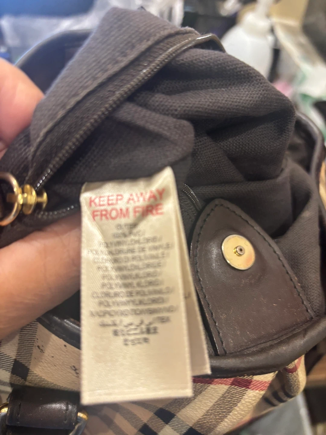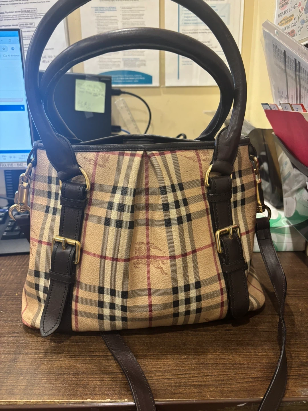 Selling a Burberry handbag with a classic plaid pattern. It features dark brown leather straps and gold-tone hardware. The interior is lined and includes a zipper pocket. It's in good condition and ready for a new home!