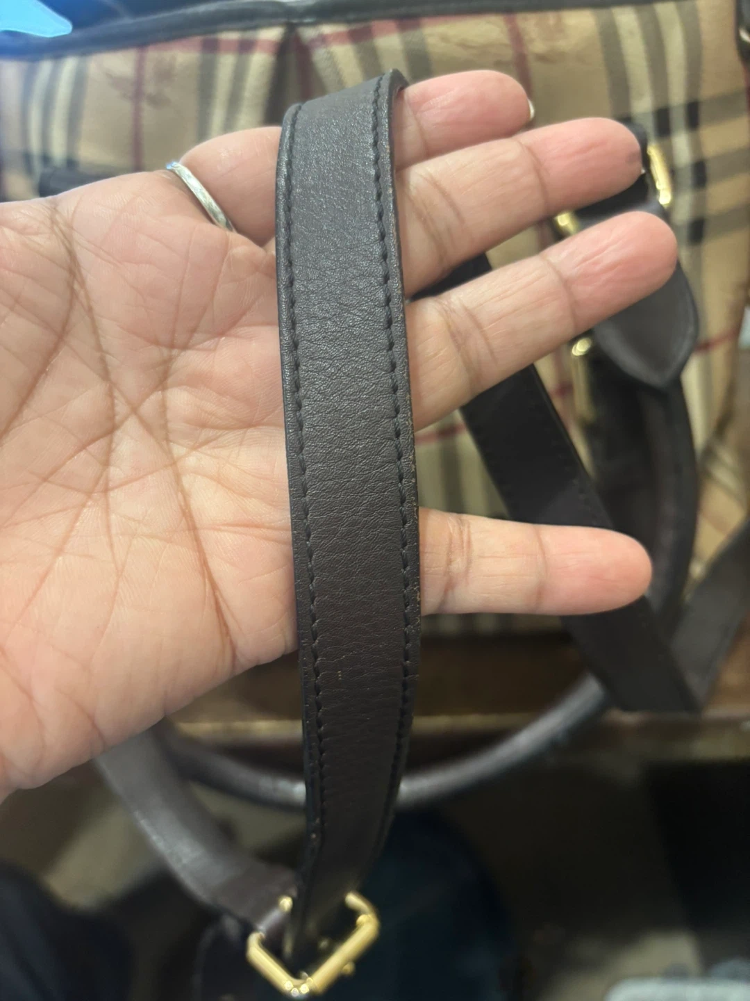Selling a Burberry handbag with a classic plaid pattern. It features dark brown leather straps and gold-tone hardware. The interior is lined and includes a zipper pocket. It's in good condition and ready for a new home!