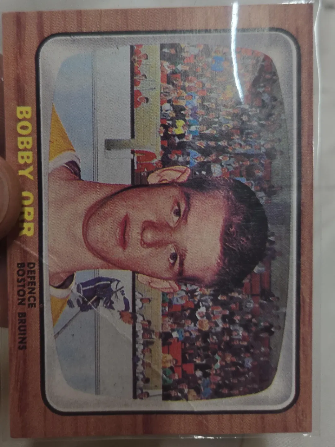 This is a Bobby Orr hockey card. It features the player in action with the Boston Bruins. The card is a collectible sports memorabilia item.