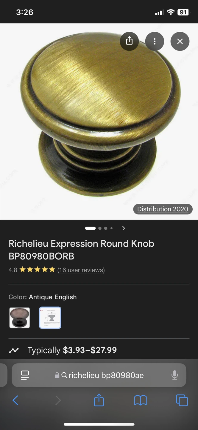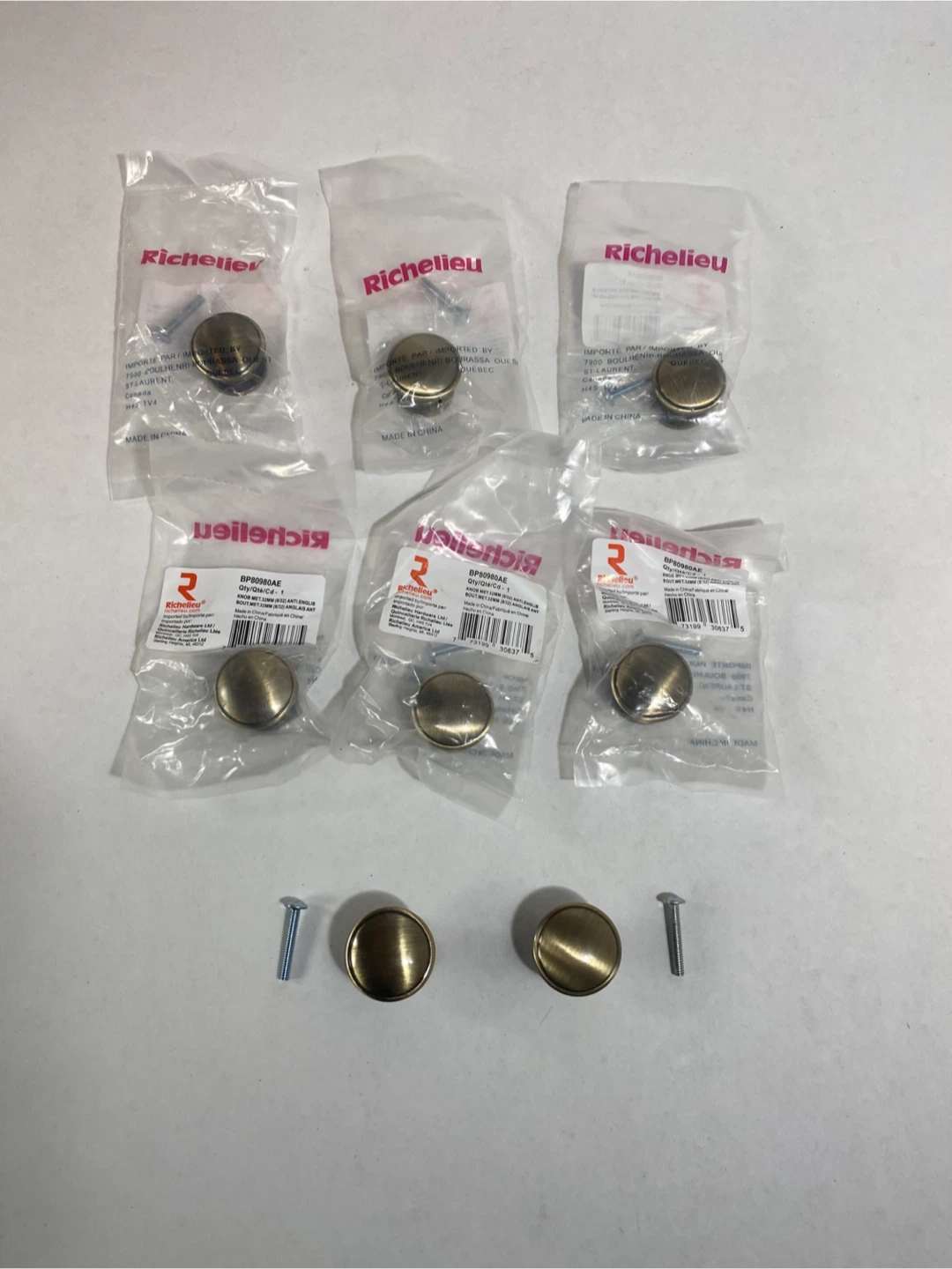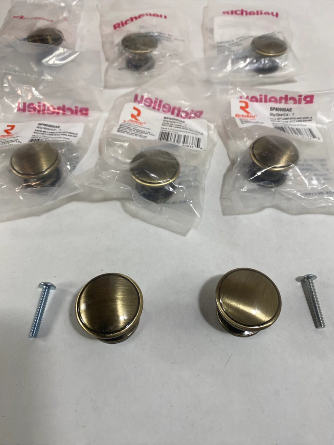 These Richelieu BP80980AE round knobs are in an antique English finish. Each knob is packaged with its mounting screw. 8 knobs included. Perfect for cabinets or drawers!